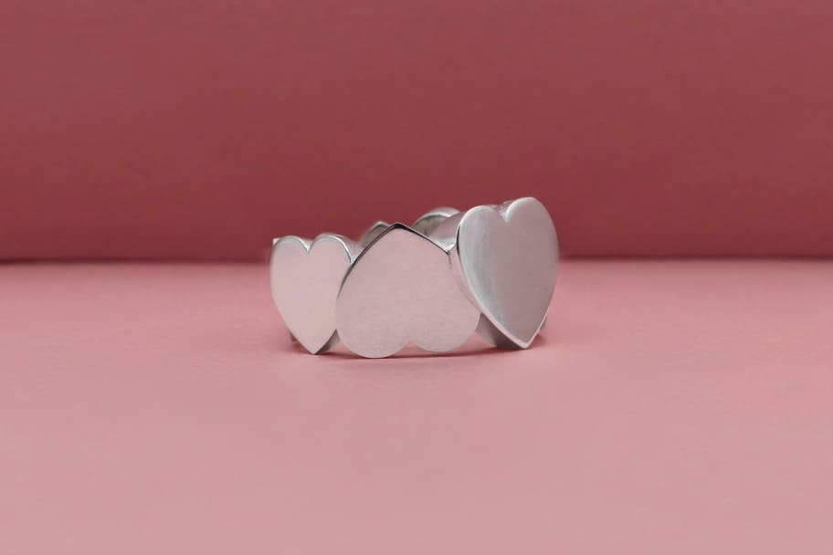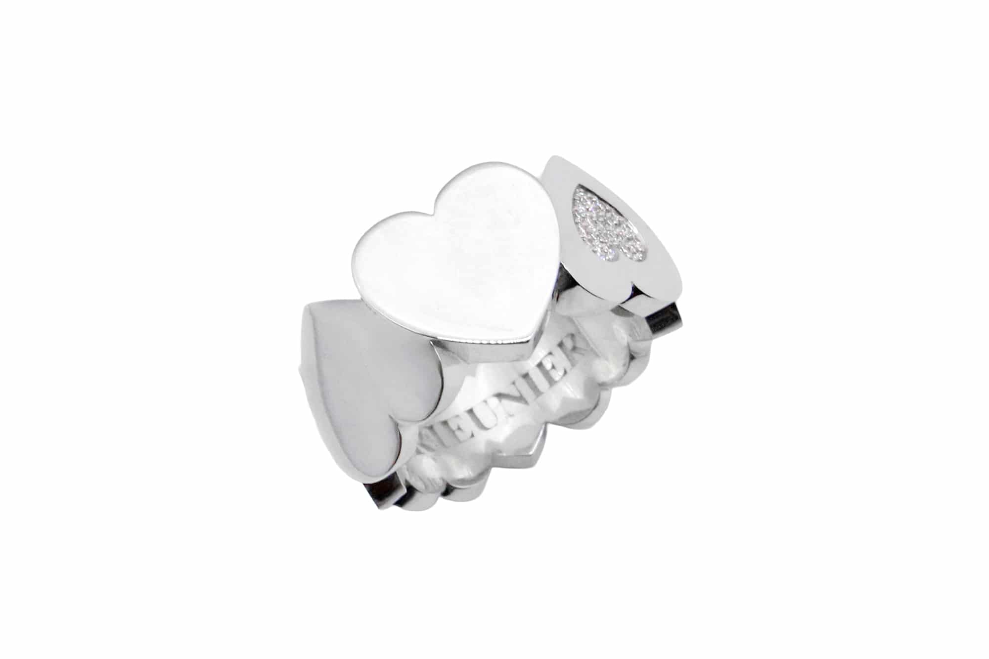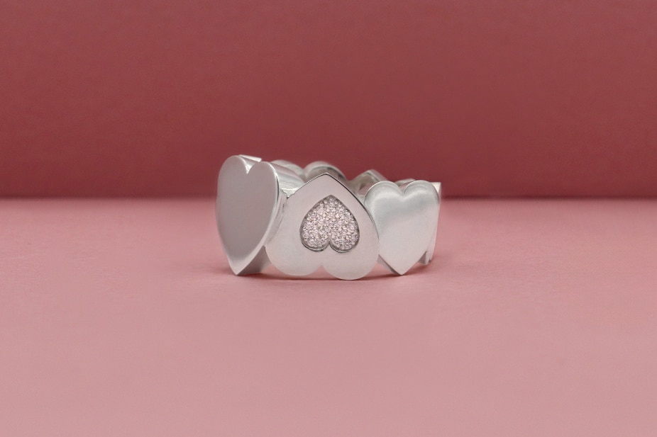Description : Bague « Aimée » en argent 925, motifs cœurs. Un des coeurs est pavé de 21 diamants taille brillant en serti « neige », environ 0,10ct au total, F/vs. Ce modèle est également réalisable en or jaune, rose, ou blanc.