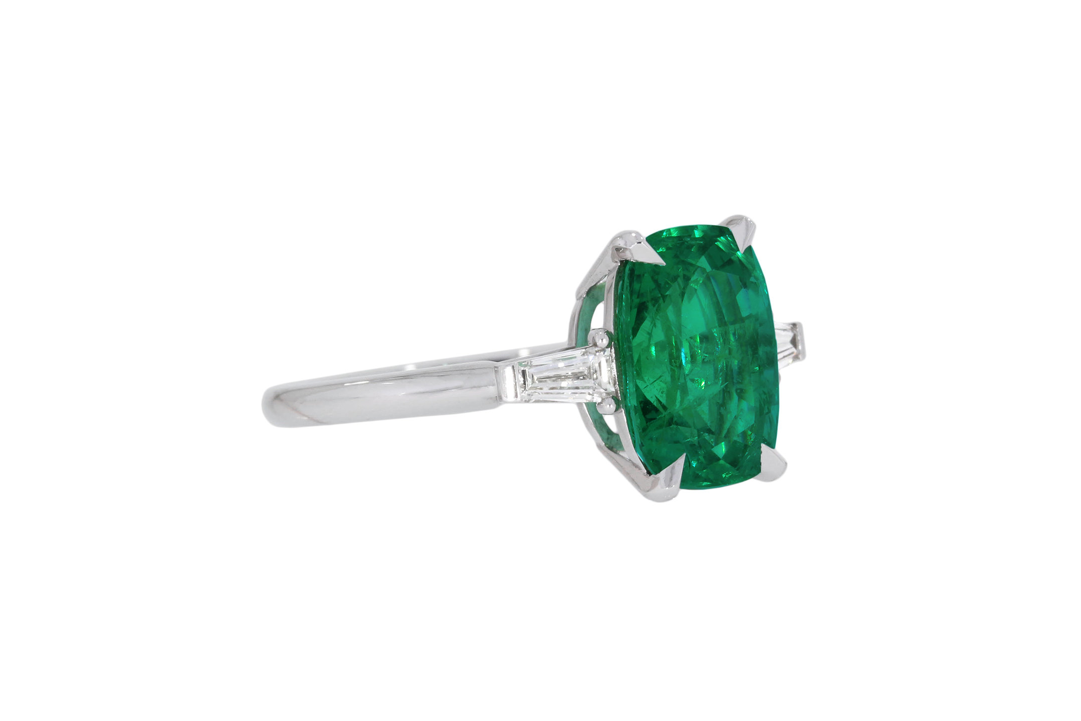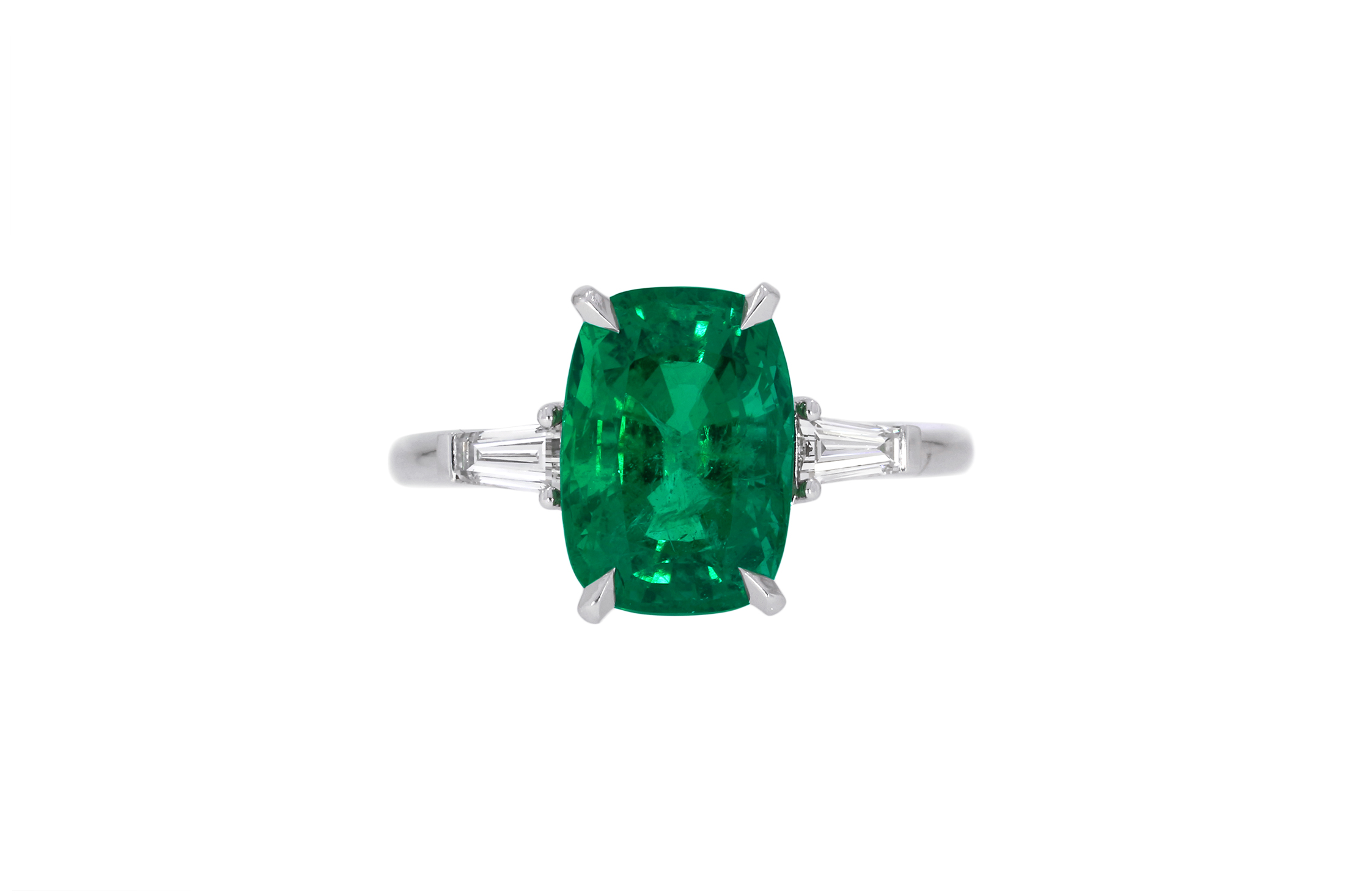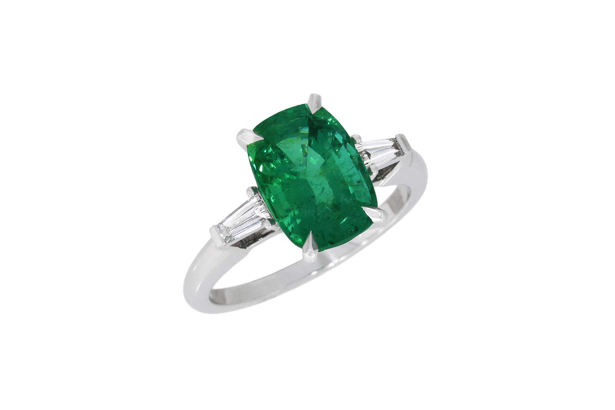 Description : Bague en or blanc palladié ornée d’une émeraude de Zambie taille coussin 3,05ct, couleur « Intense Green », encadrée par deux diamants taille tapers, 0.25ct au total E/vs.