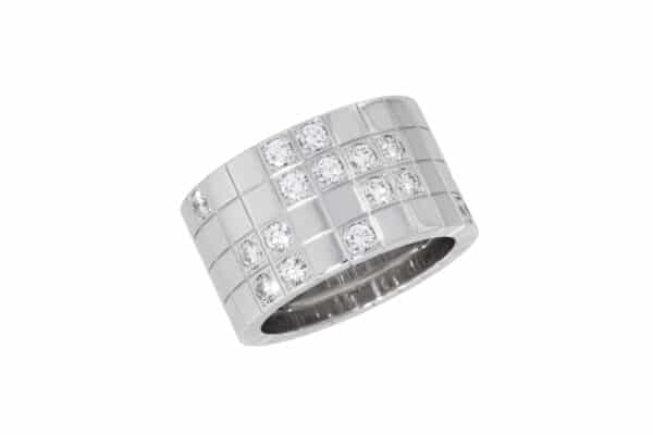 Description : Bague Cartier « Lanière » grand modèle, anneau en or blanc serti de 15 diamants taille brillant, 0.70ct au total.