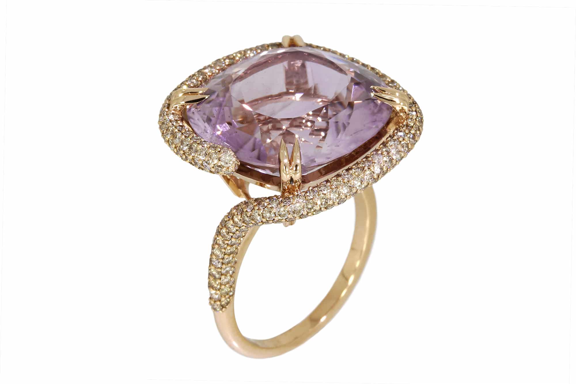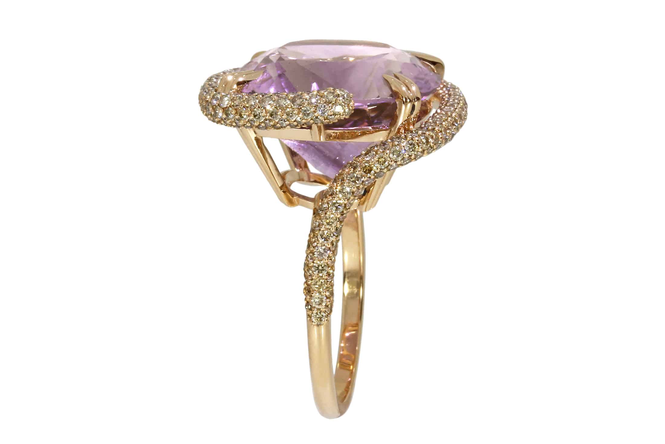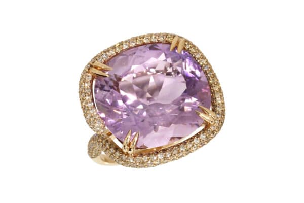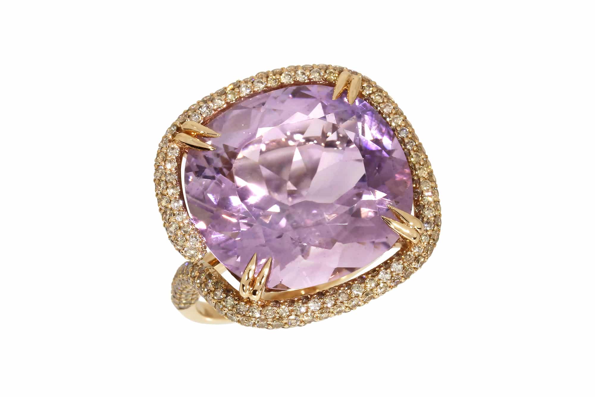 Description : Superbe bague en or rose ornée d’une importante améthyste « Rose de France » 17,72ct , origine Brésil, sublimé par 307 diamants bruns taille brillant, 1.44ct au total.