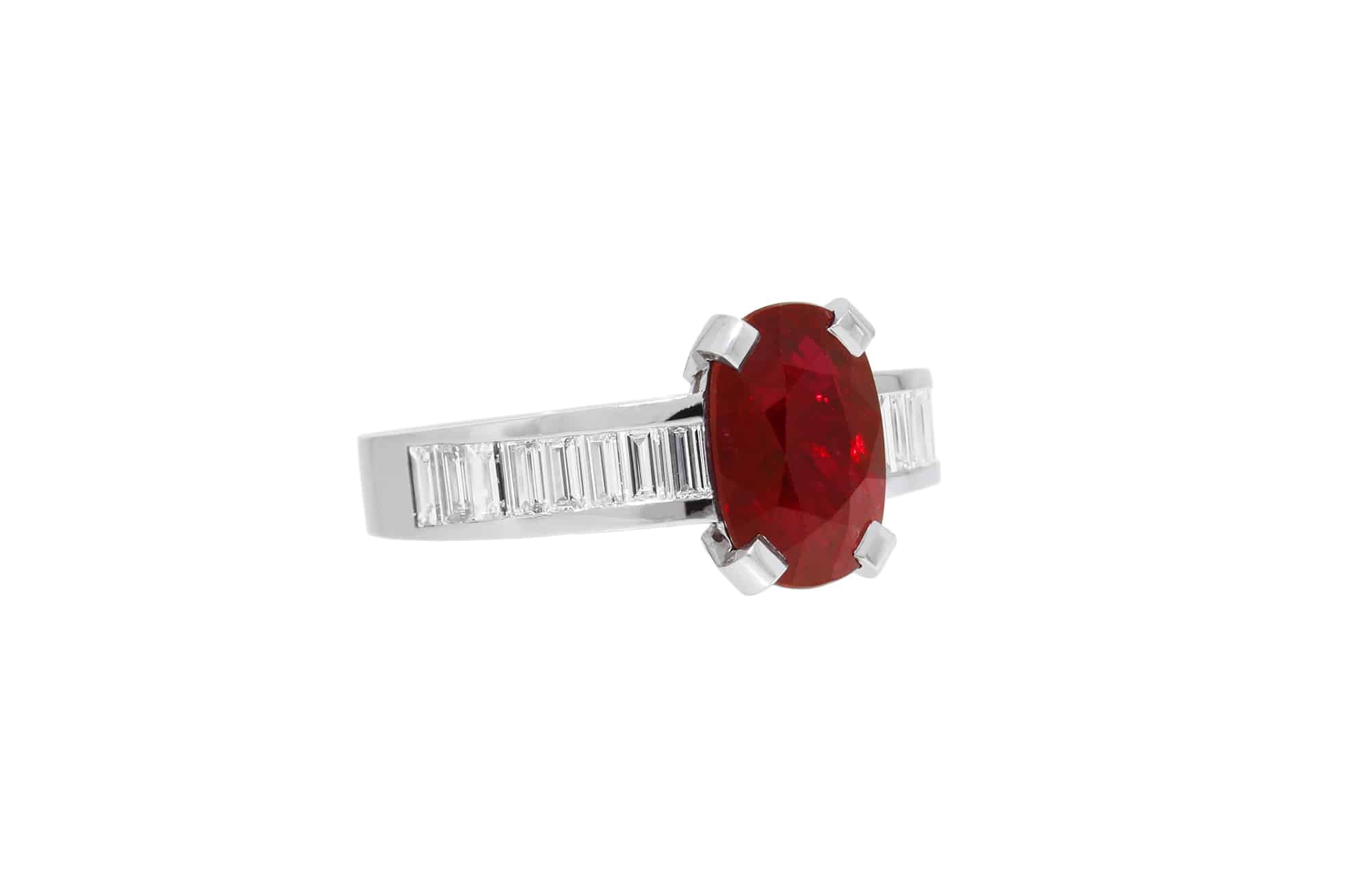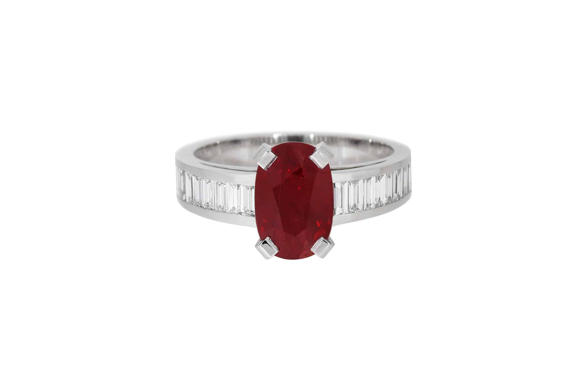 Description : Bague en platine ornée d’un superbe rubis taille ovale 2.72ct « Vivid Red » origine Mozambique, encadré par 16 diamants taille baguette, 0.70ct au total. Ce rubis est accompagné de son certificat.