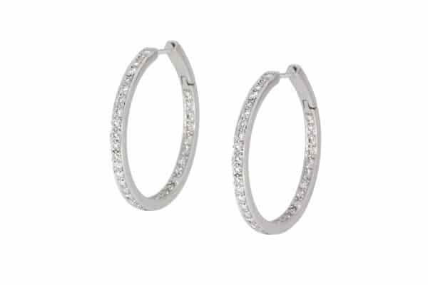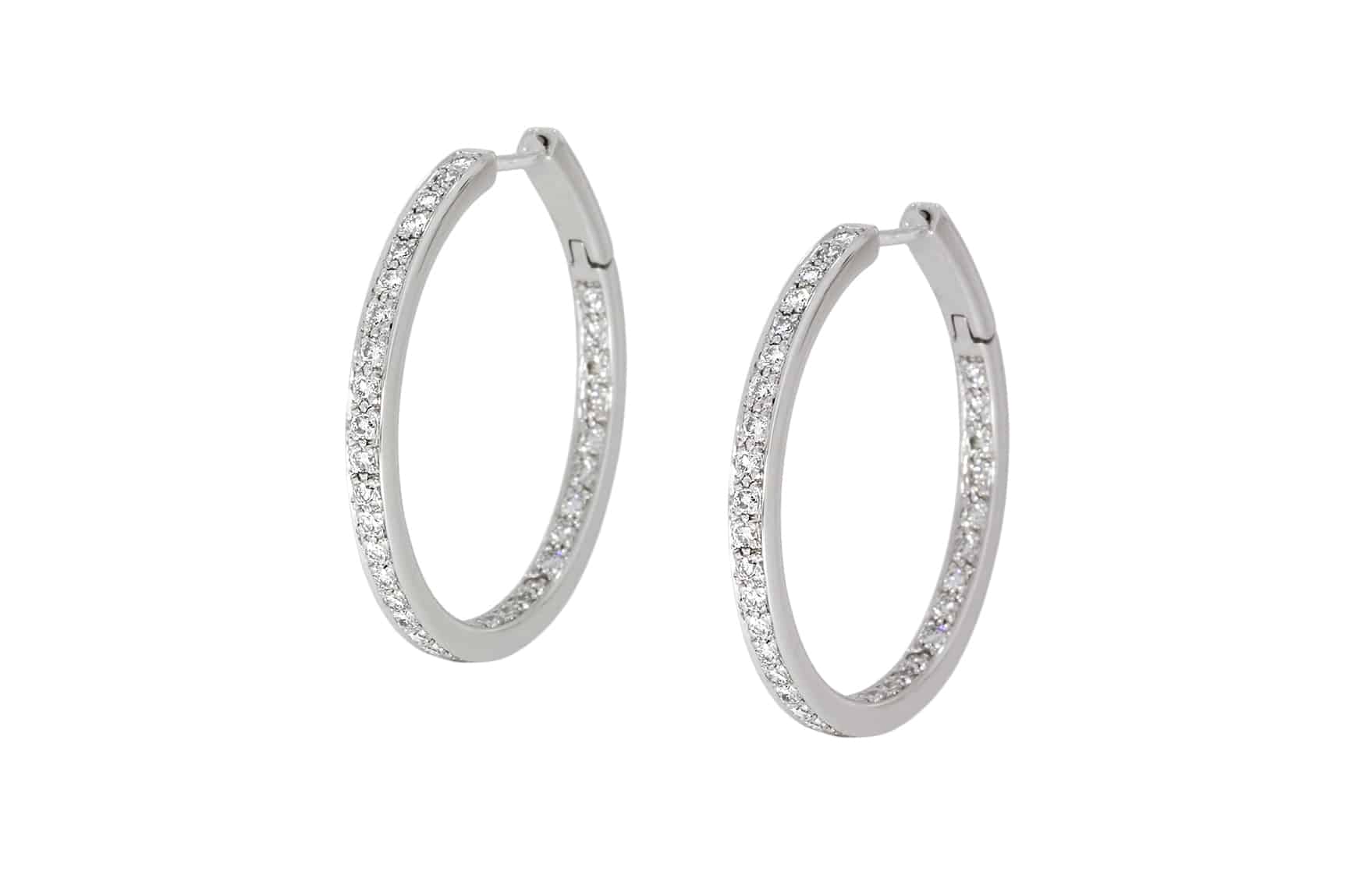 Description : Elégante paire de créoles en or blanc, serties de 66 diamants taille brillant, 1,08ct au total, G/vs.