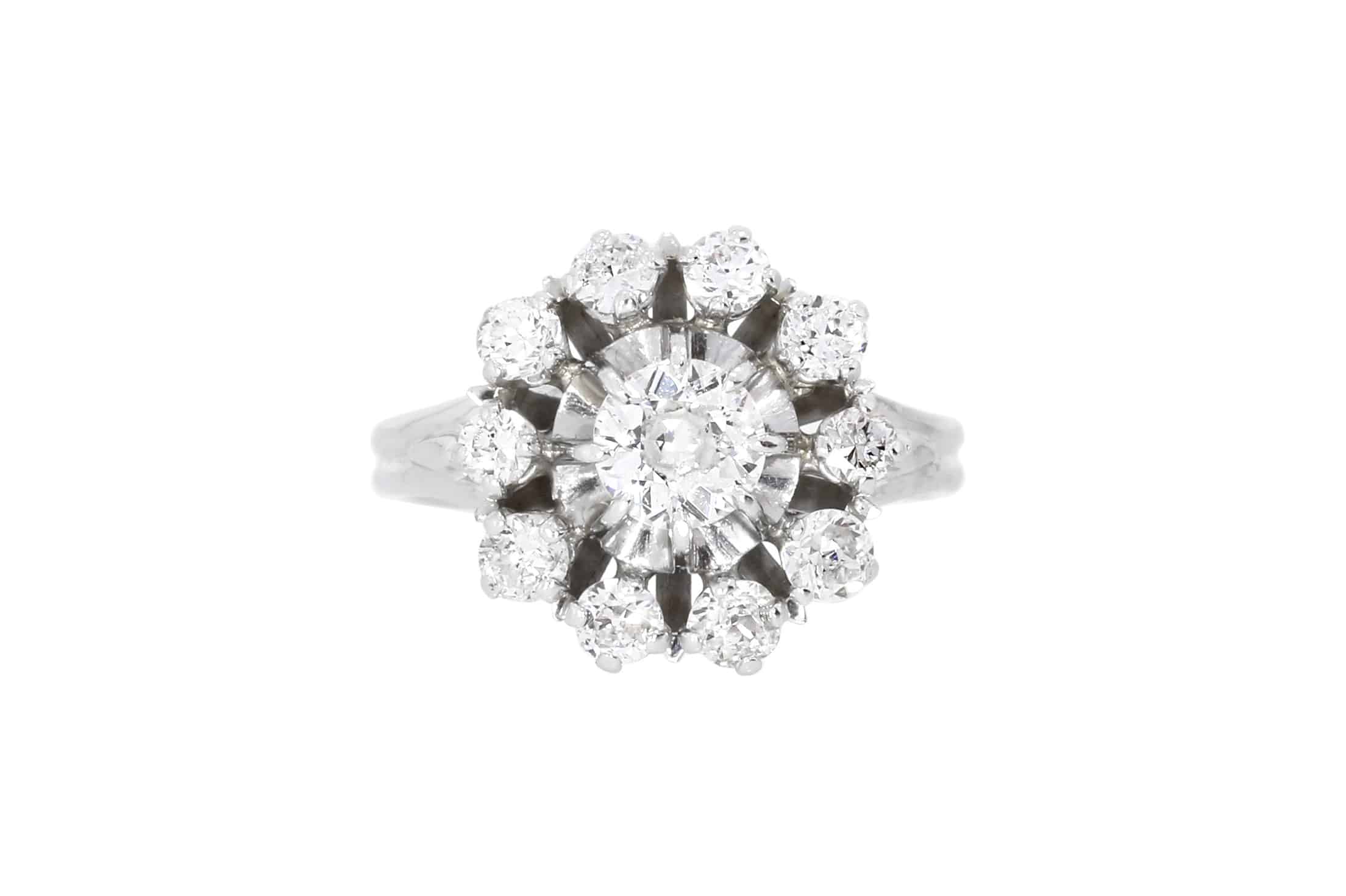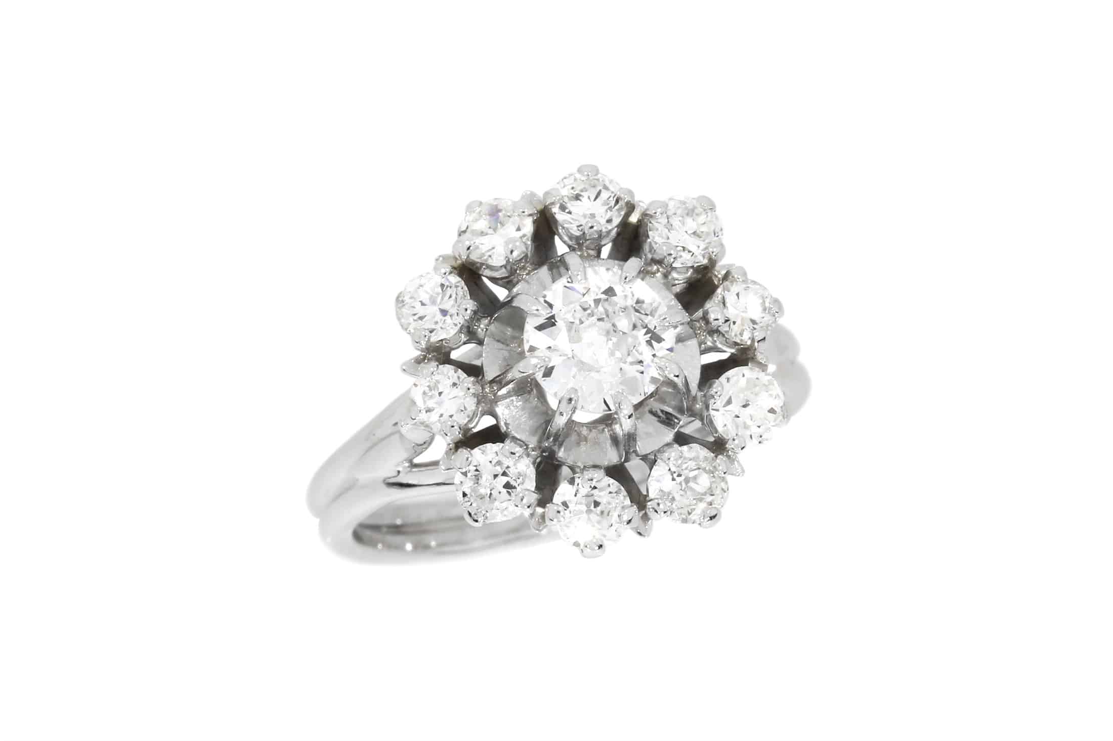 Bague entourage ancienne des années 1950, en or blanc et platine, ornée au centre d’un diamant taille ancienne environ 0.80ct, entouré de 10 diamants taille ancienne, environ 1.00ct au total.
