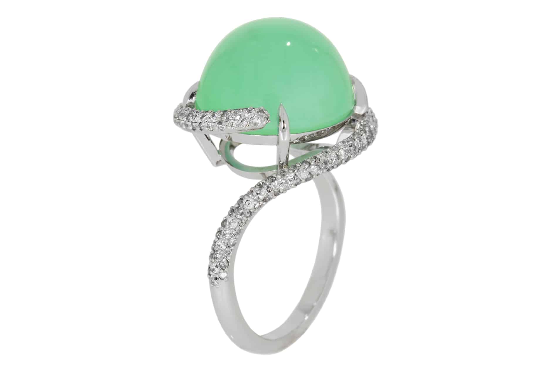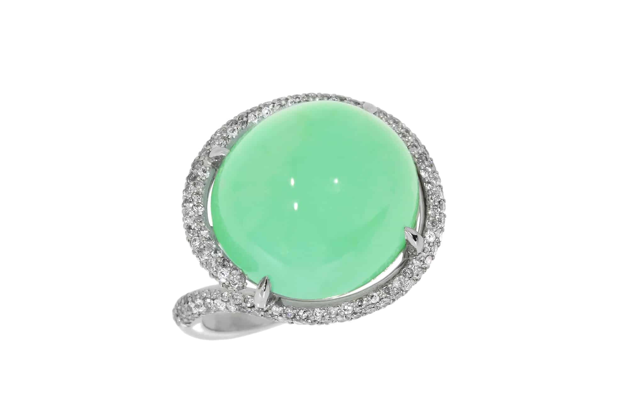 Description : Superbe bague en platine ornée d’une importante chrysoprase taille cabochon 16.18ct, sublimée par 178 diamants « salt and peppers » taille brillant, 0.69ct au total.