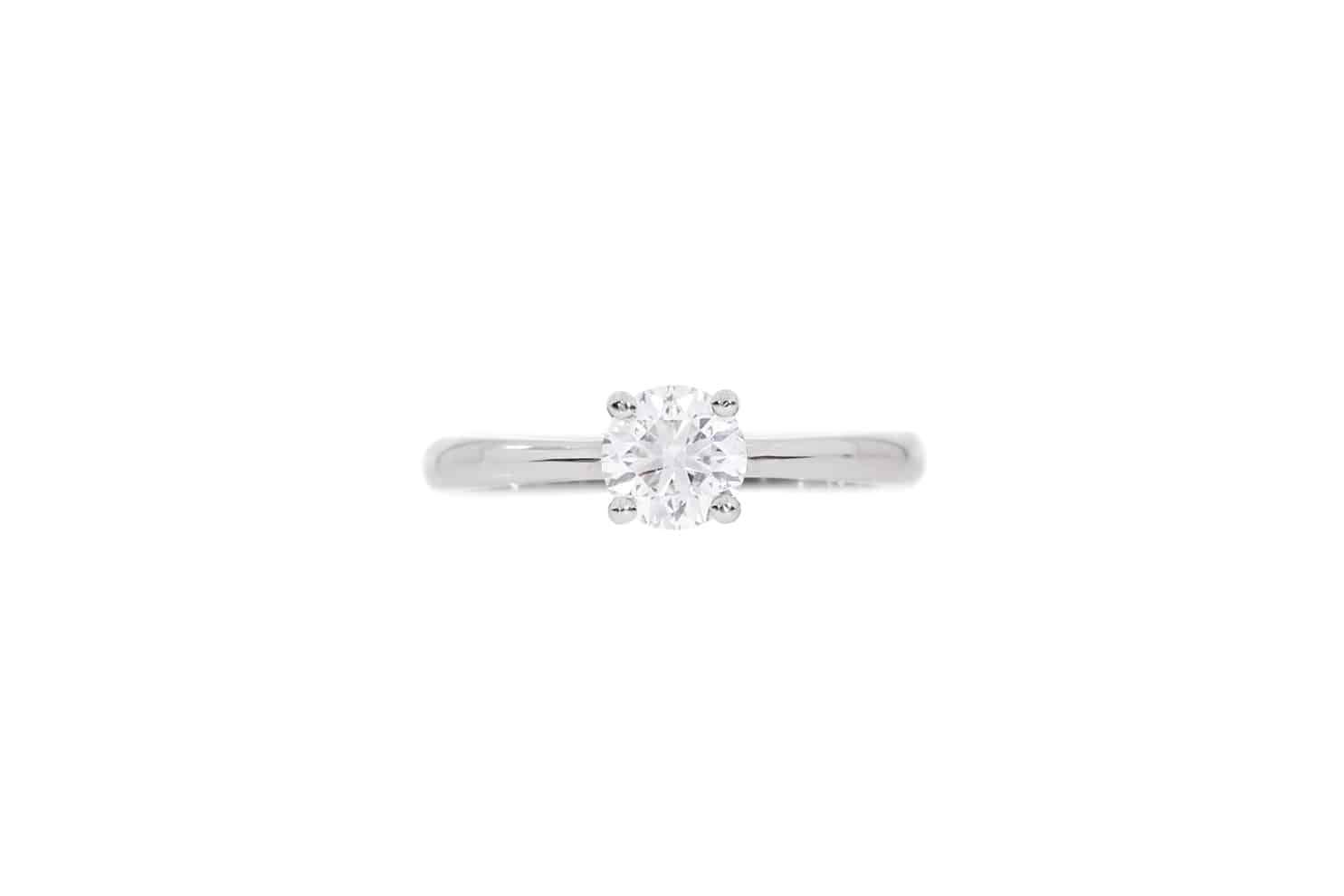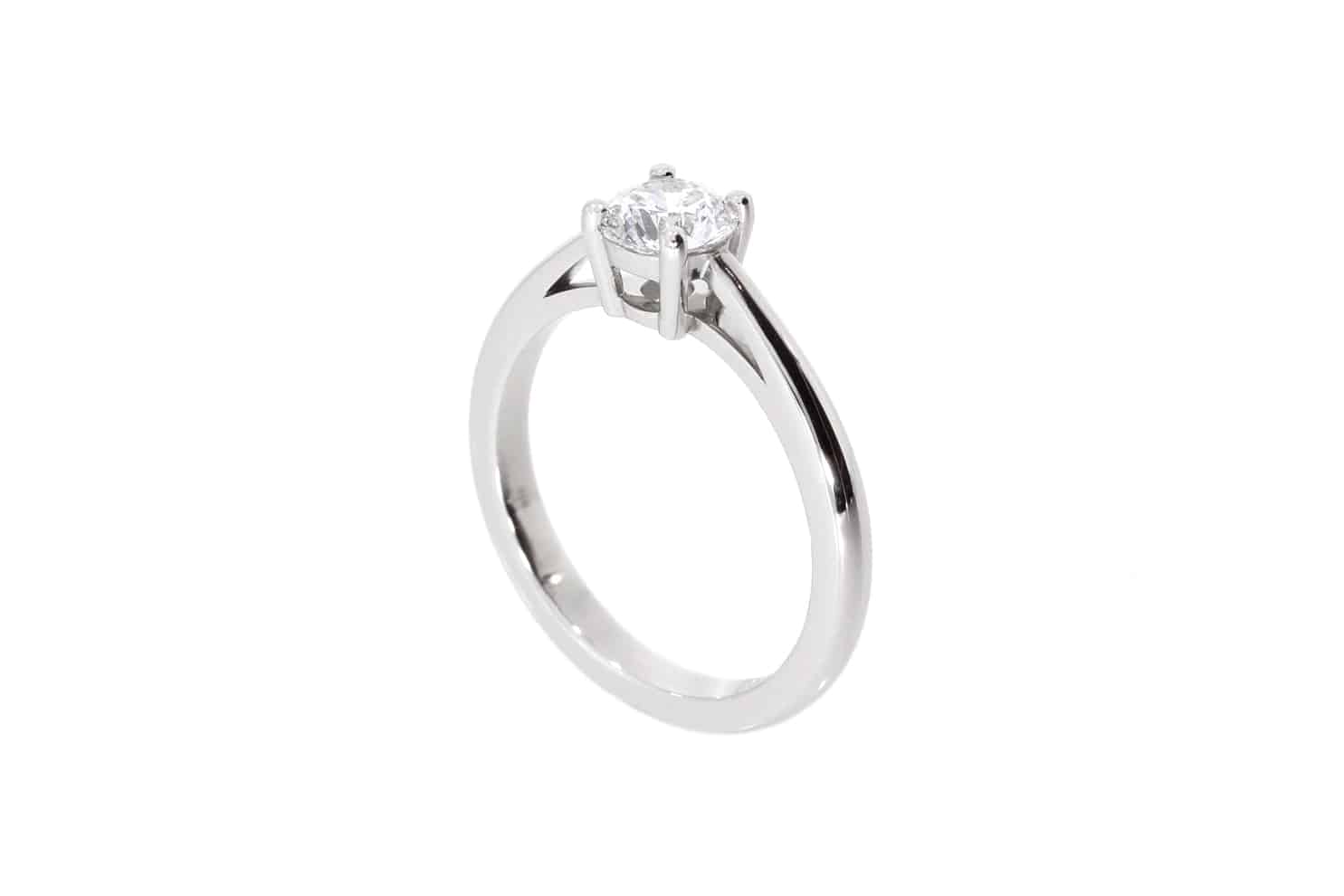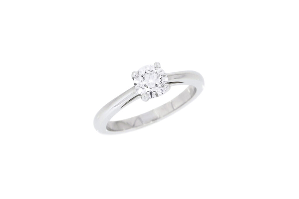 Description : Bague solitaire en platine ornée d’un diamant taille brillant 0,52ct, qualité D/si2. Diamant accompagné de son certificat GIA.