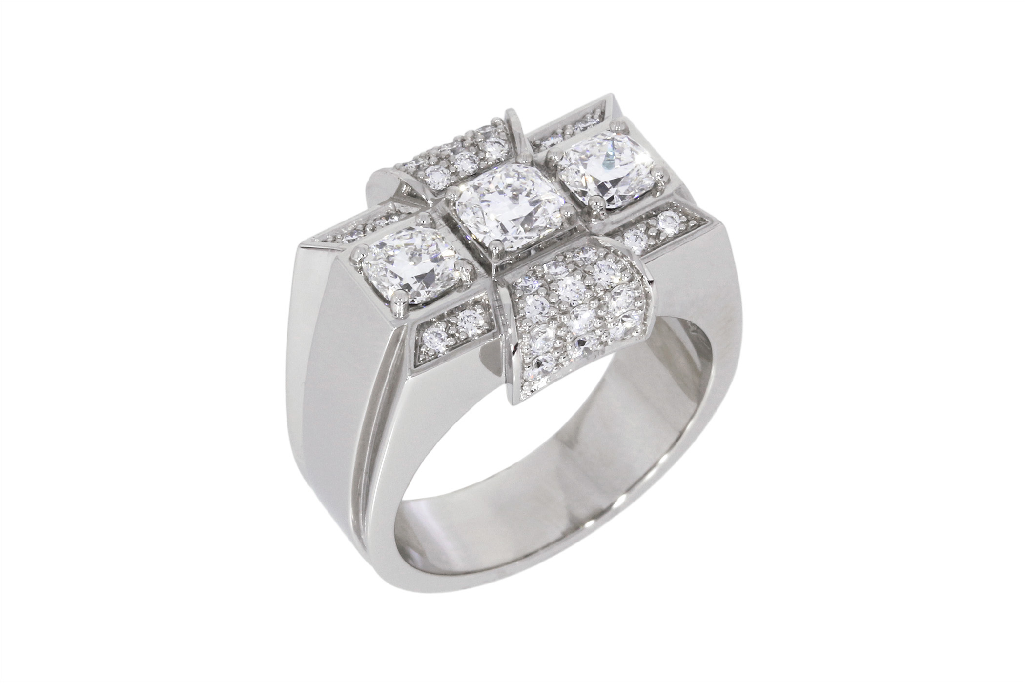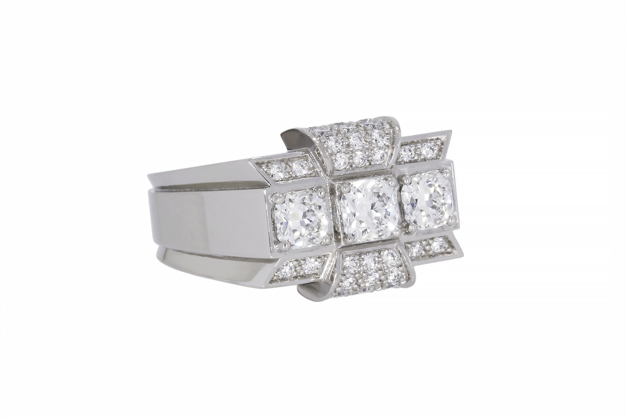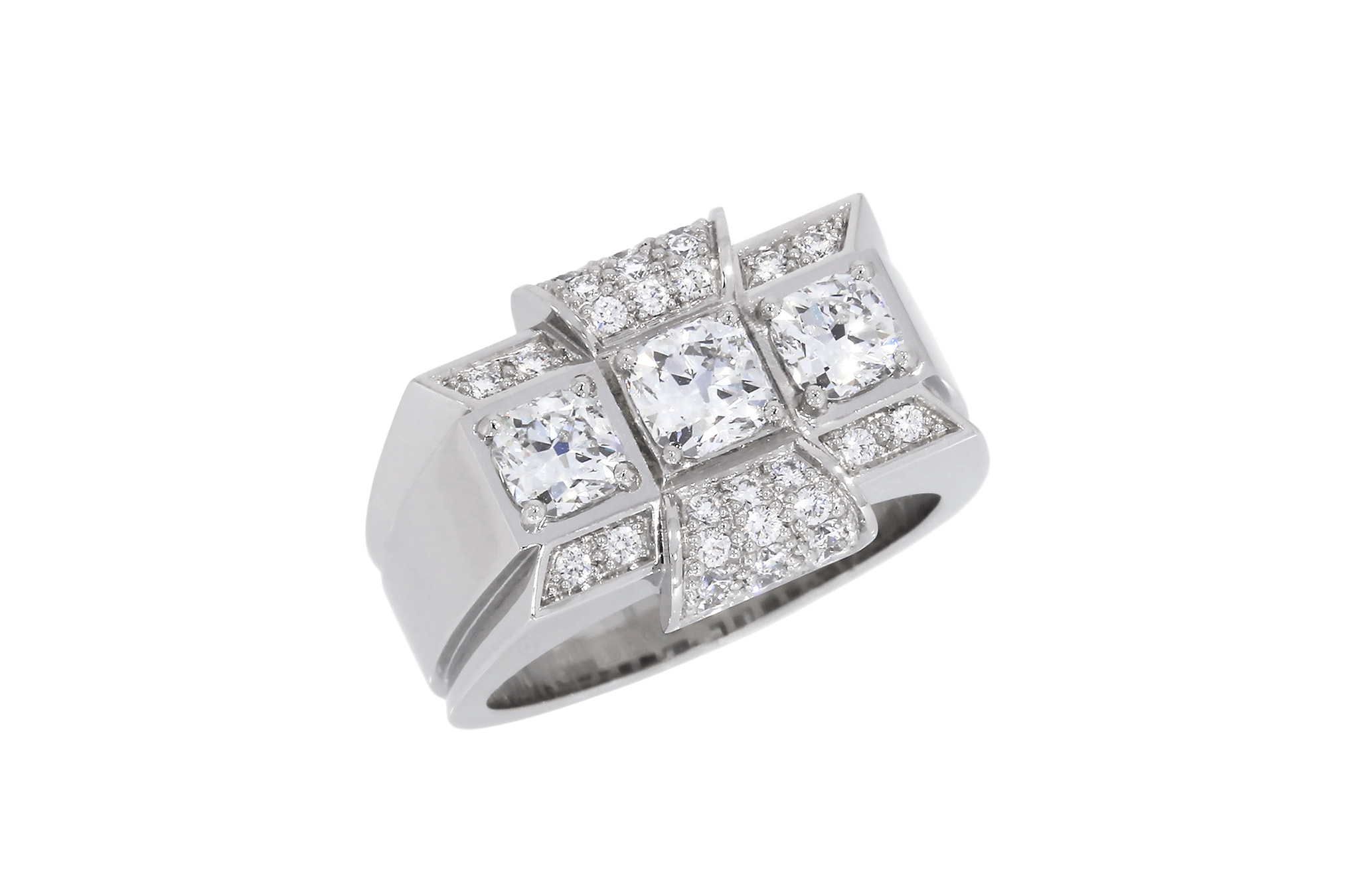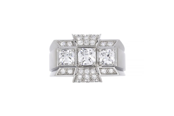 Description : Superbe bague « Tank » en platine ornée de trois diamants taille coussin, 0.69ct au total, ainsi que de 32 diamants taille brillant, 0.36ct au total, D/F/vs.