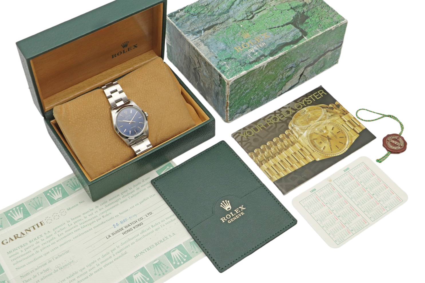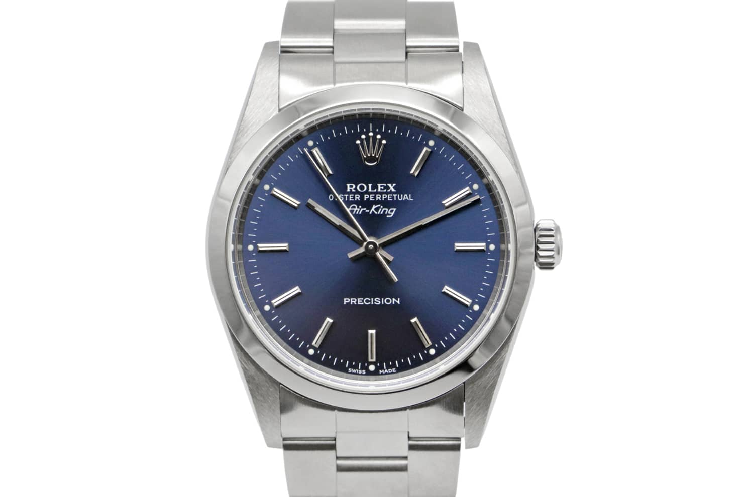 Description : Montre Rolex Air King en acier référence 14000 de 2000. Boitier 34mm, cadran bleu, index bâtons. Bracelet Oyster. Mouvement automatique, calibre 3000.