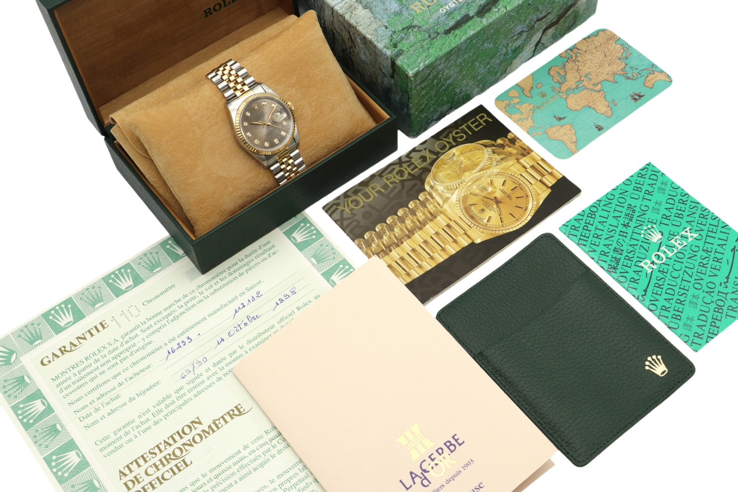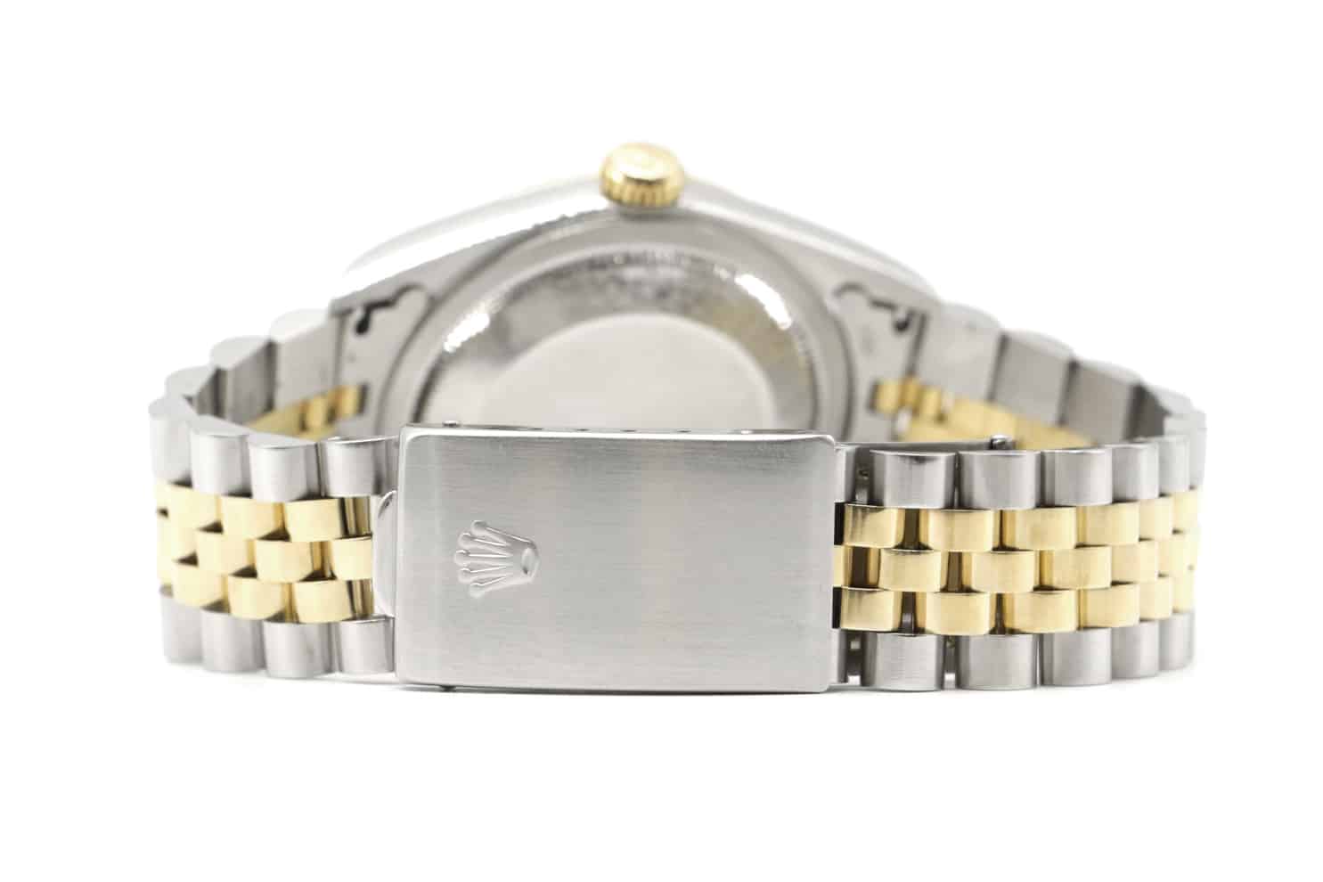 Description : Rare montre Rolex Datejust 36, référence 16233 de 1995. Boîtier en or jaune et acier de 36mm, cadran silver pâtiné et index diamants. Lunette cannelée en or jaune, bracelet jubilee en or jaune et acier. Mouvement automatique, calibre 3135.