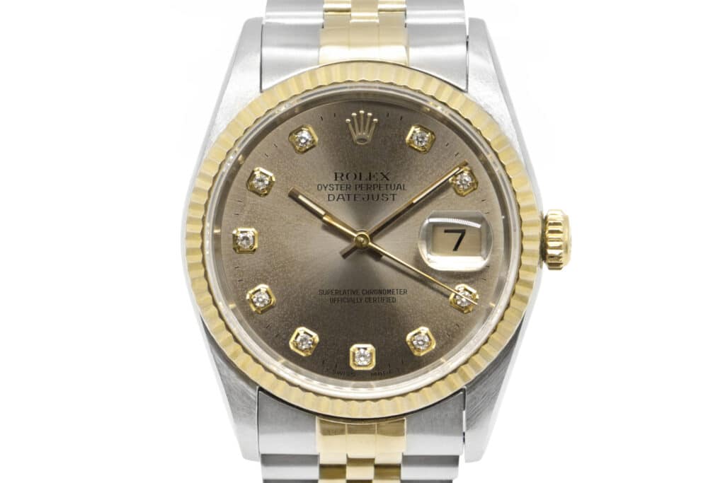 Description : Rare montre Rolex Datejust 36, référence 16233 de 1995. Boîtier en or jaune et acier de 36mm, cadran silver pâtiné et index diamants. Lunette cannelée en or jaune, bracelet jubilee en or jaune et acier. Mouvement automatique, calibre 3135.