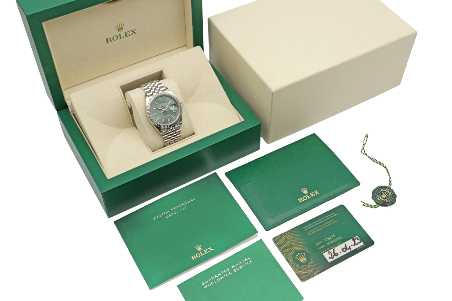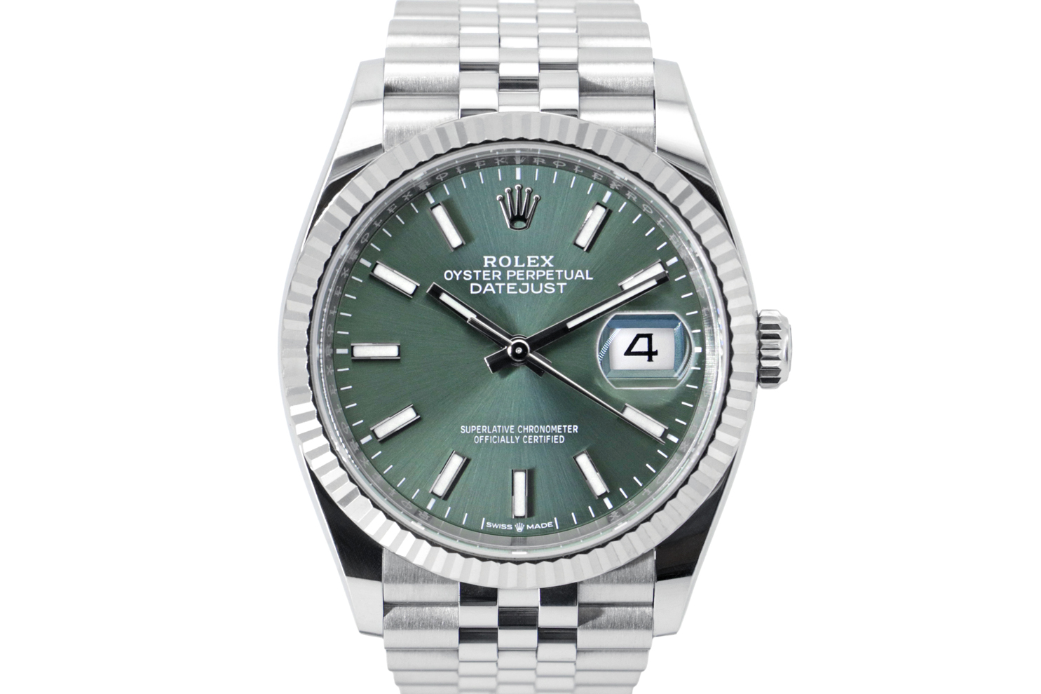 Description : Superbe montre Rolex Datejust 36 de 2023, référence 126234. Boîtier en acier de 36mm, cadran vert menthe et index bâtons, lunette cannelée en or gris, bracelet jubilee en acier. Mouvement automatique, calibre 3235.