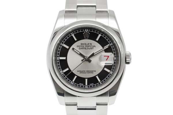 Description : Rare montre Rolex Datejust 36 « Tuxedo », référence 126200 de 2006. Boîtier en acier de 36mm, cadran dit « Tuxedo » à disque central argenté et contour noir, lunette lisse, bracelet oyster en acier. Mouvement automatique, calibre 3135.