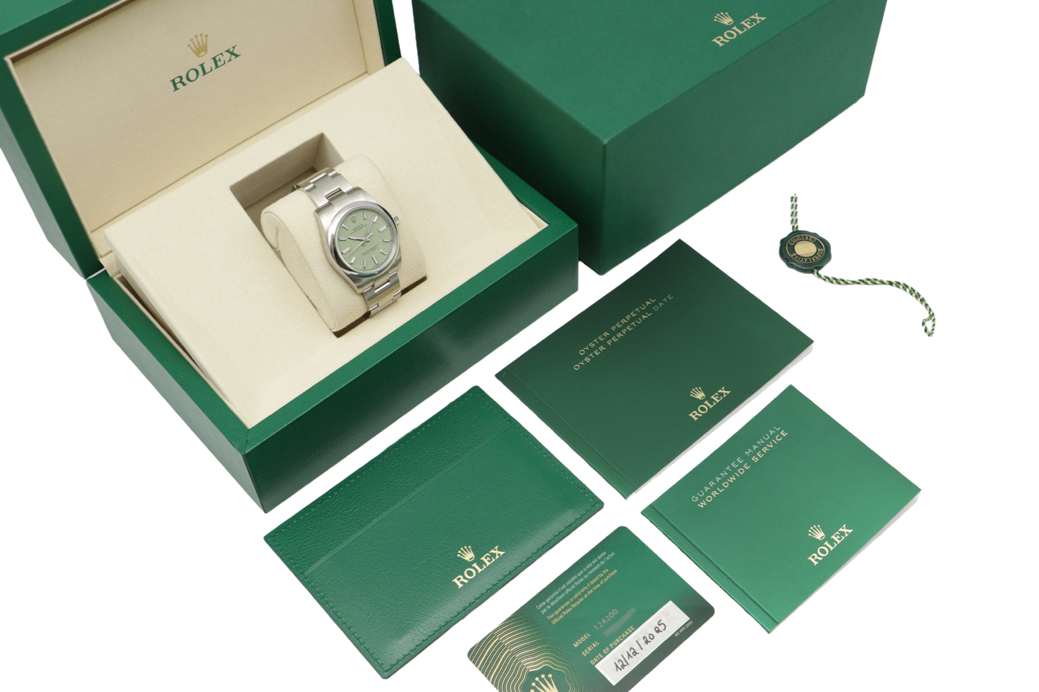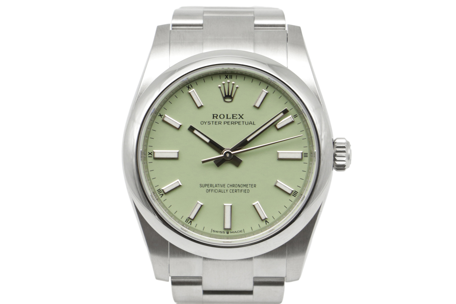 Description : Superbe montre Rolex Oyster Perpetual 34 de 2025, référence 124200. Boîtier en acier de 34mm, cadran vert pistache et index bâtons, bracelet oyster en acier. Mouvement automatique, calibre 3230.