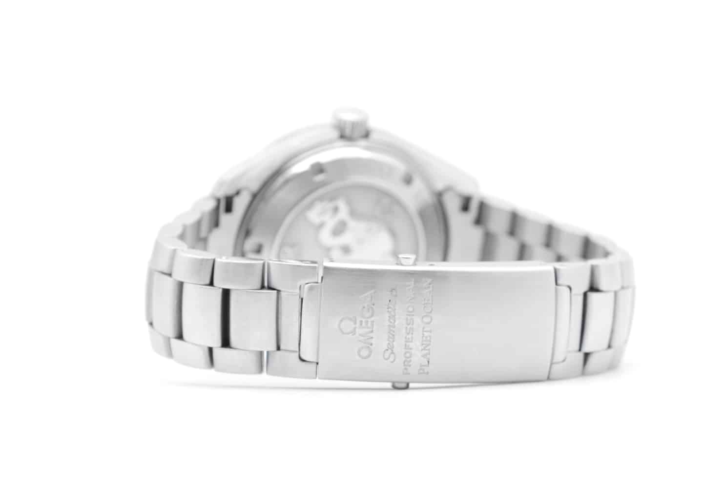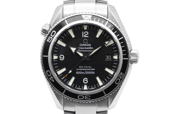 Description : Montre Omega Seamaster Planet Ocean de 2009 en acier. Référence 2201.50.00. Boîtier de 39,5 mm, cadran noir, index trapèzes. Mouvement automatique Omega Co-Axial 2500. Bracelet acier.