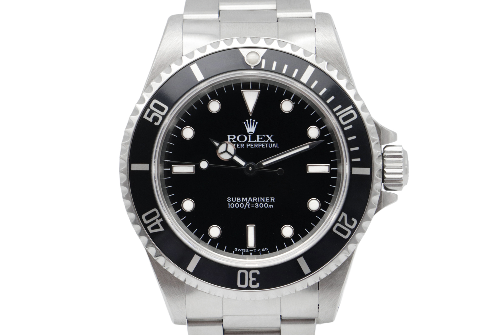 Description : Superbe montre Rolex Submariner No-Date de 1998, référence 14060. Boîtier en acier de 40mm, cadran noir, lunette rotative unidirectionnelle noire, bracelet oyster en acier.
