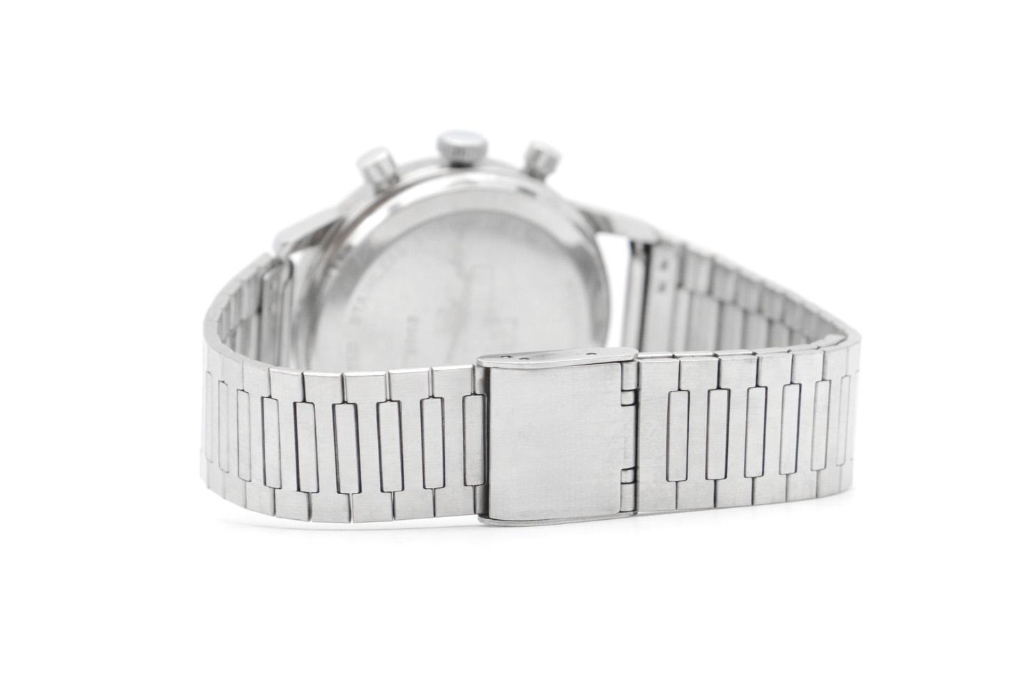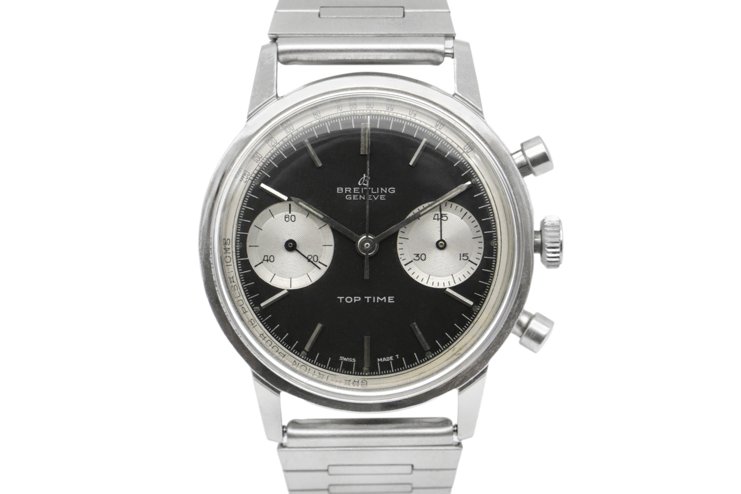Description : Montre Breitling Top Time en acier référence 2002. Boitier 36mm, cadran noir « reverse panda », index bâtons. Bracelet acier. Mouvement mécanique à remontage manuel, calibre 3130.