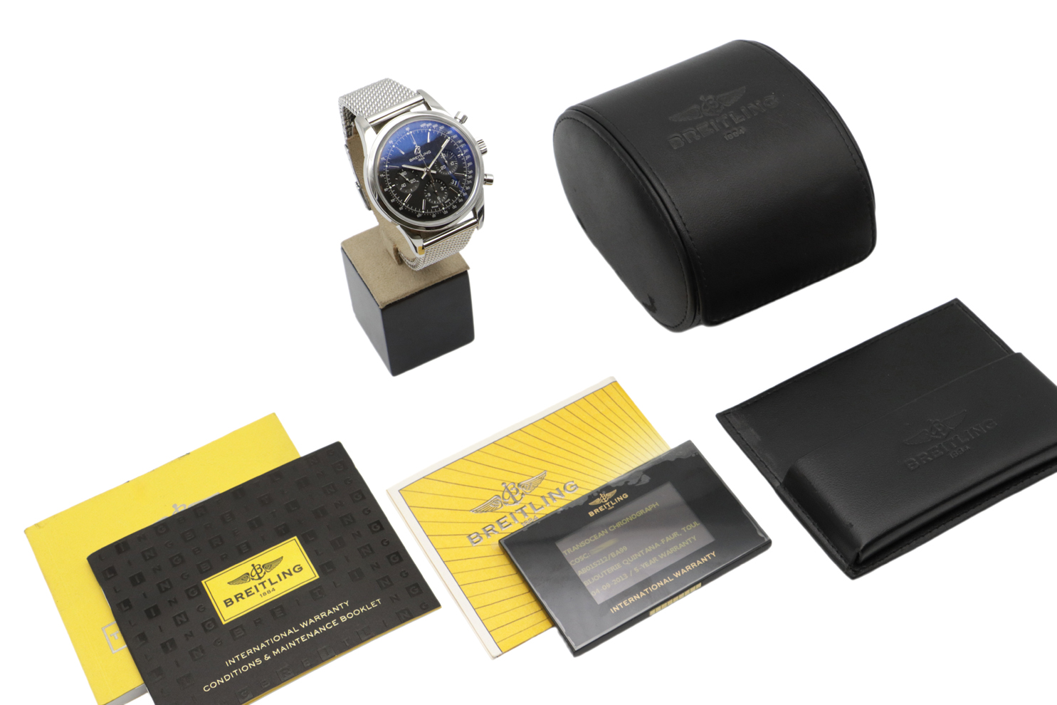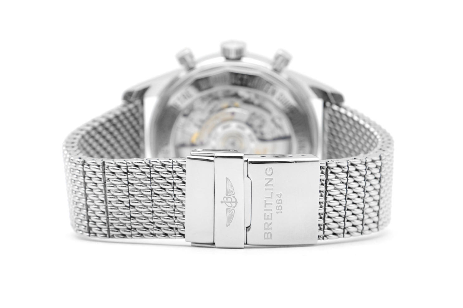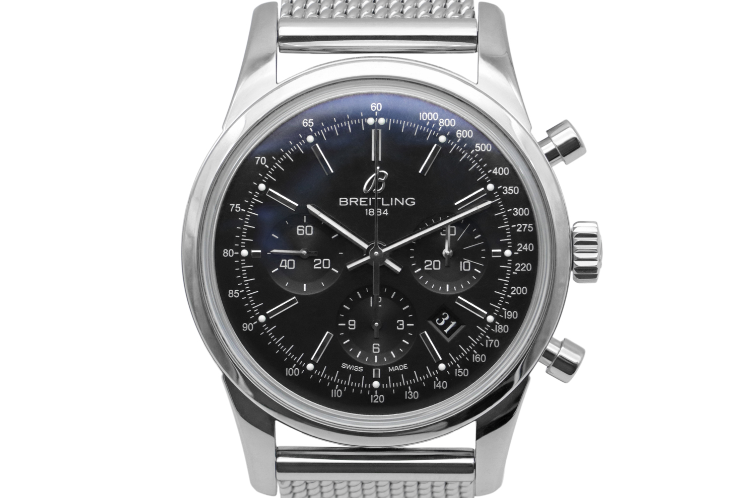 Description : Montre breitling Transocean Chronograph en acier référence AB0152 de 2013. Boitier 43mm, cadran noir, index bâtons. Bracelet milanais en acier. Mouvement automatique, calibre B01.
