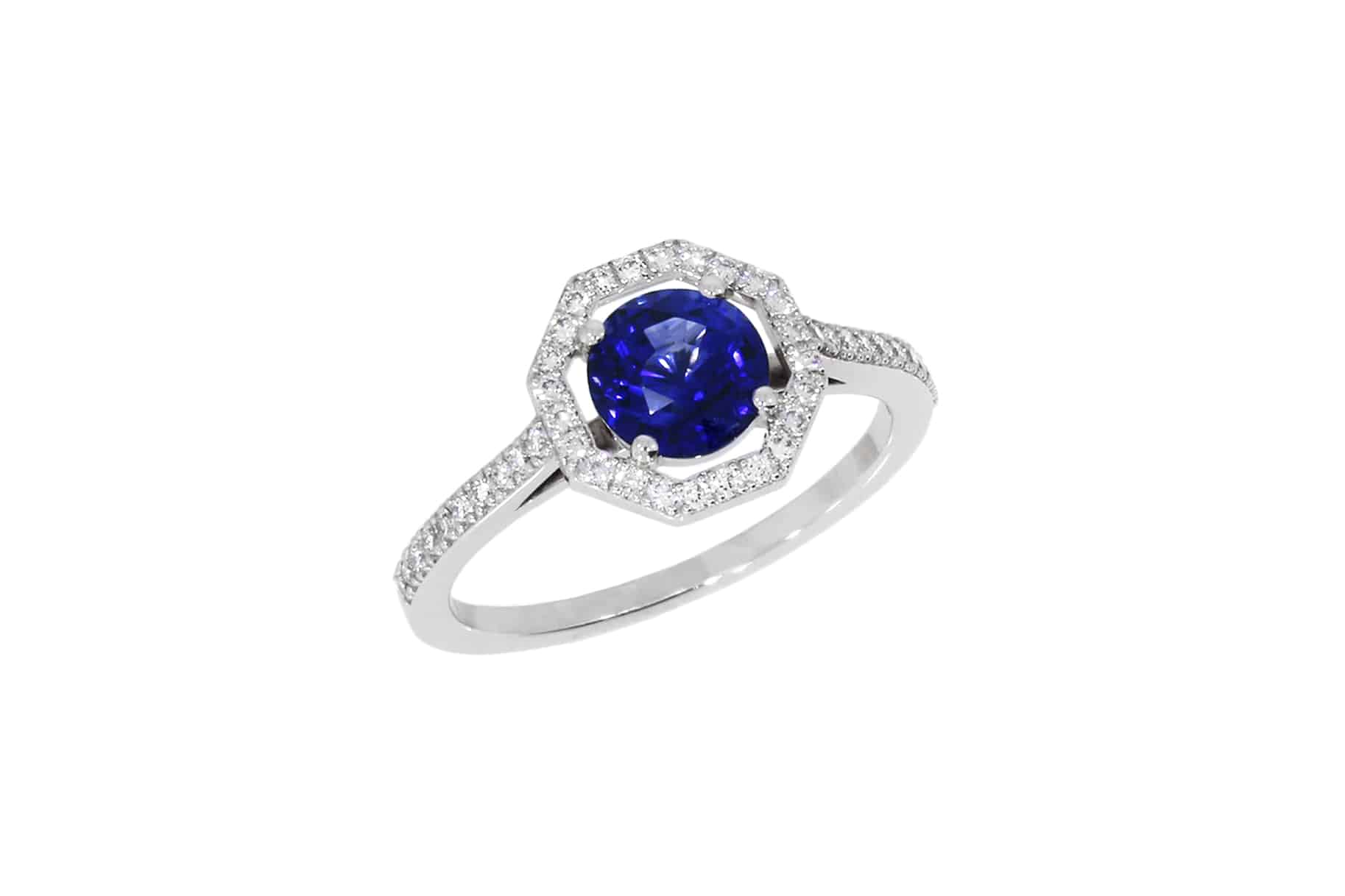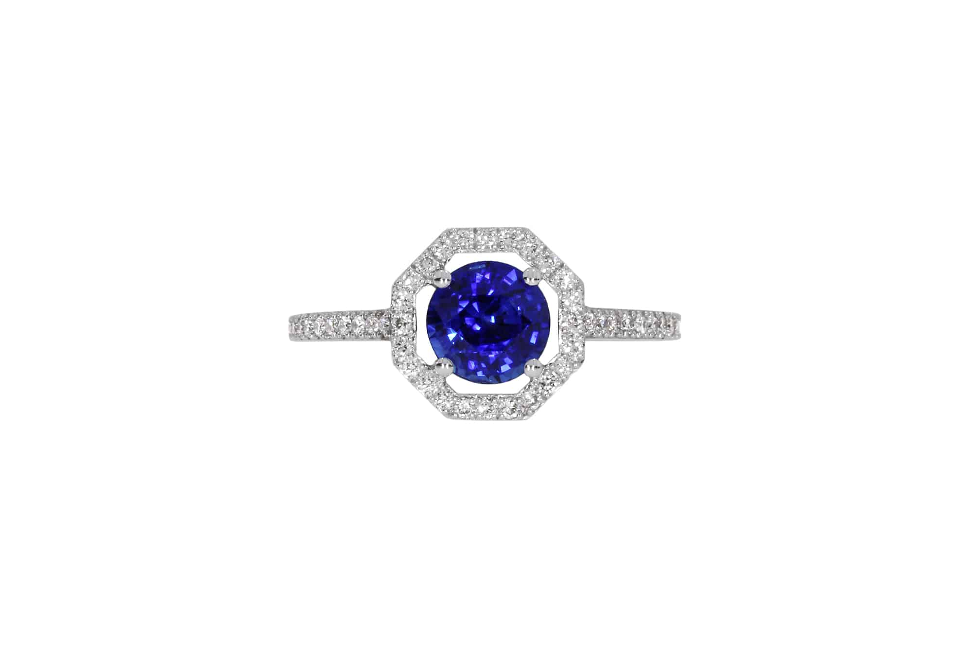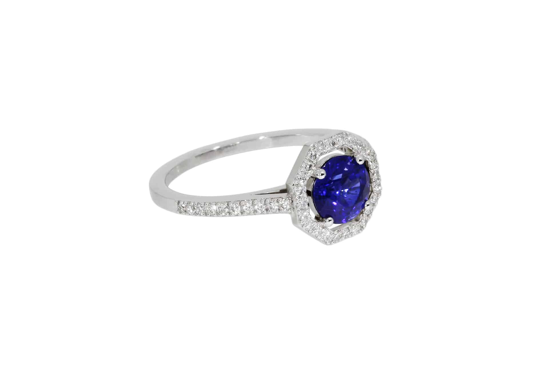 Description : Bague en or blanc orné au centre d’un superbe saphir rond 1ct, couleur « Royal Blue », sublimé par un entourage hexagonale et le haut du corps de bague sertis de 44 diamants taille brillant, 0,176ct au total, E/VS.