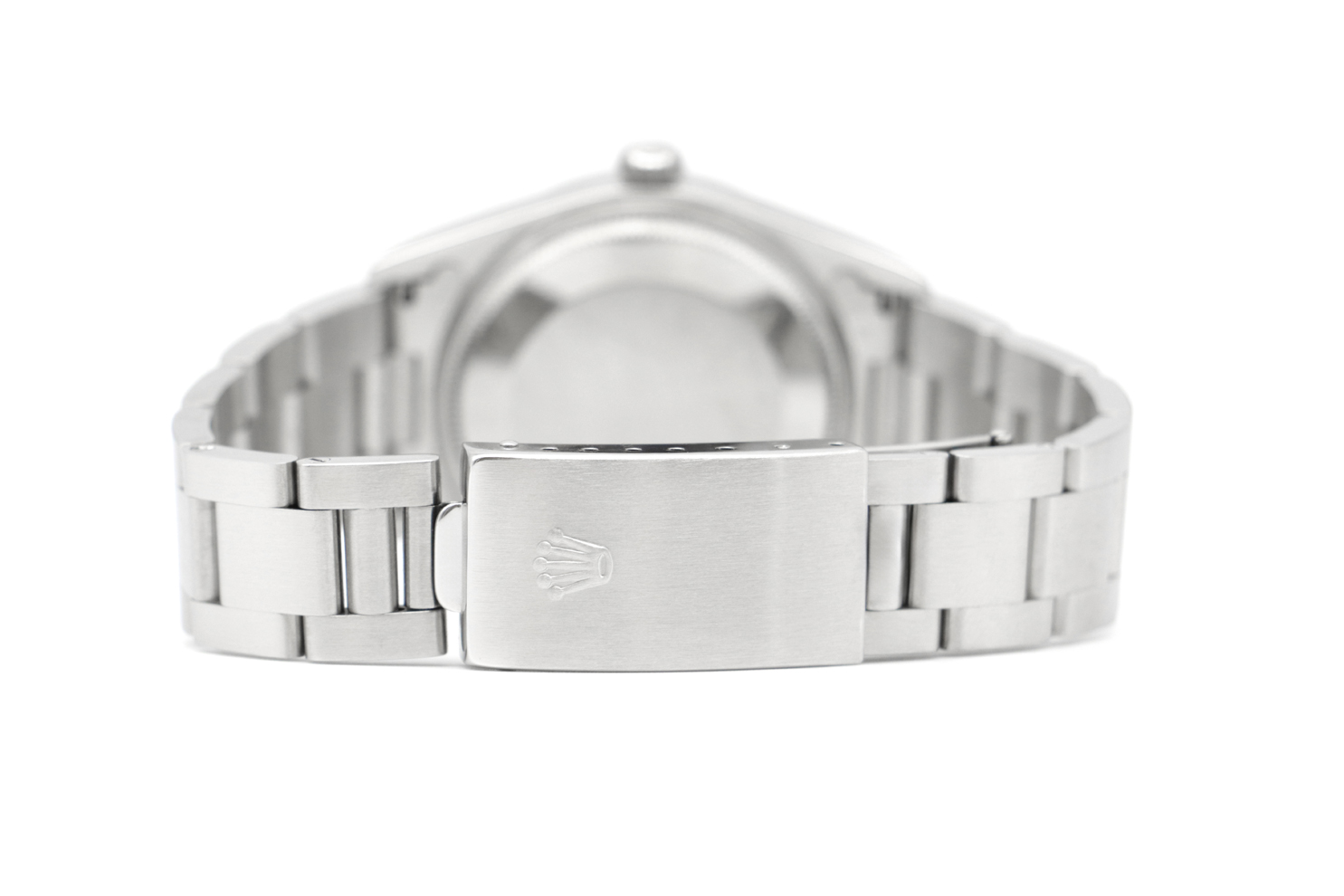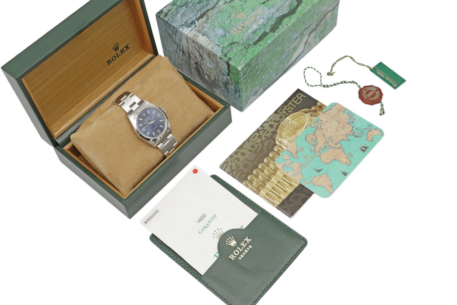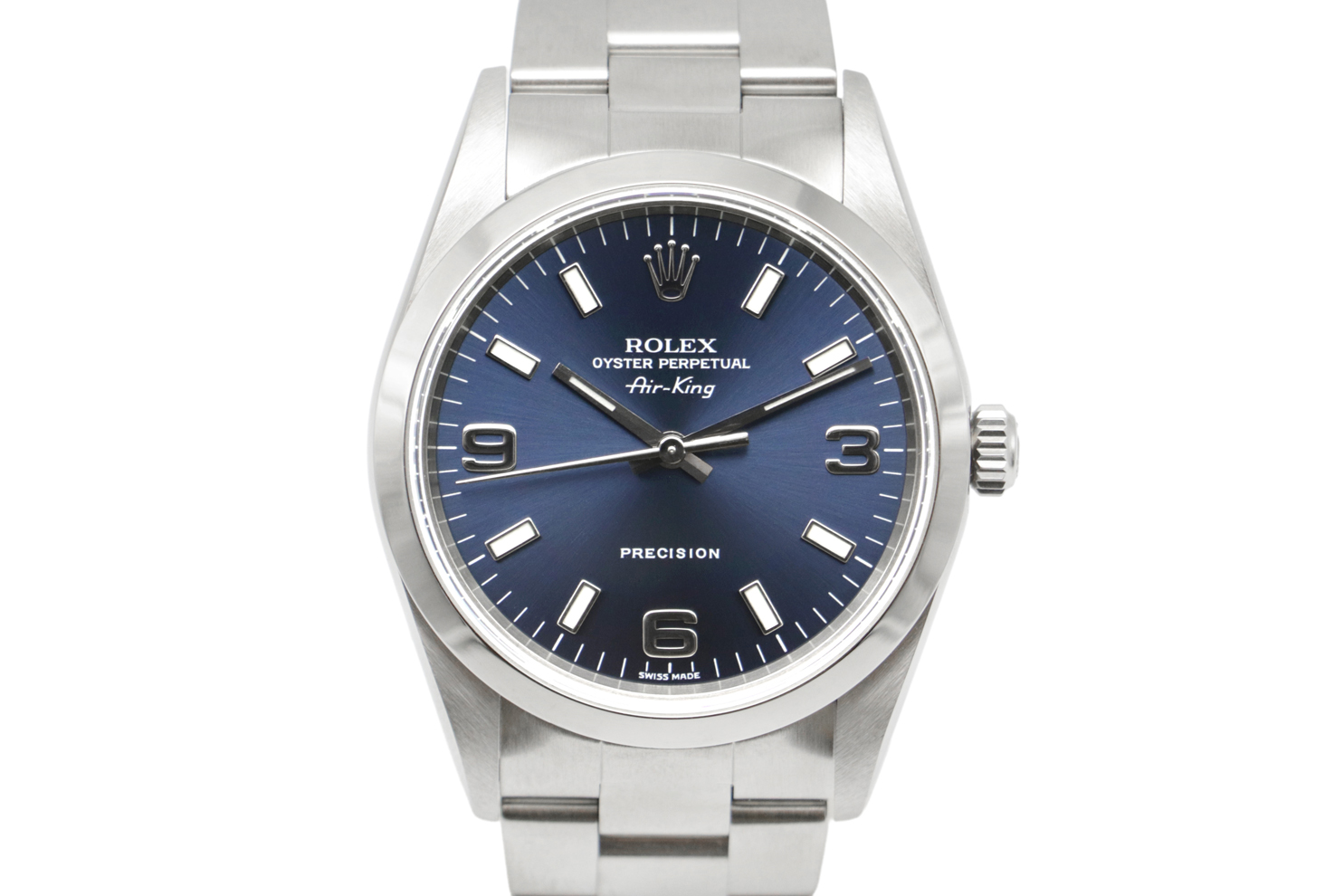 Description : Montre Rolex Air King en acier référence 14000 de 2000. Boitier 34mm, cadran bleu, index bâtons et 3-6-9. Bracelet Oyster. Mouvement automatique, calibre 3000.