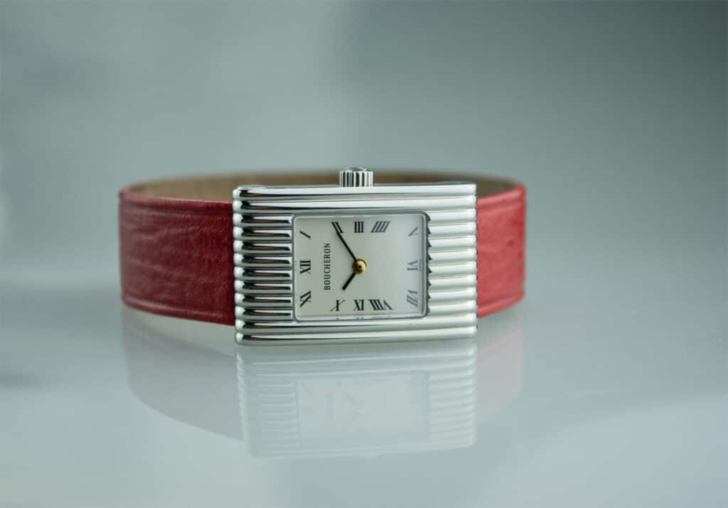 Description : Graphique et moderne, la montre Reflet joue avec la lumière grâce à son boîtier rectangulaire à godrons. Bracelet en cuir rouge, fermoir invisible. Mouvement quartz. Disponibles avec ce modèle : un bracelet galuchat, quatre bracelets en cuir d’autruche, quatre bracelets en cuir d’alligator. Nous nous tenons à votre disposition et serons ravis de vous accueillir dans notre boutique 3 rue Cantegril, ou par téléphone au 05.62.89.94.24.