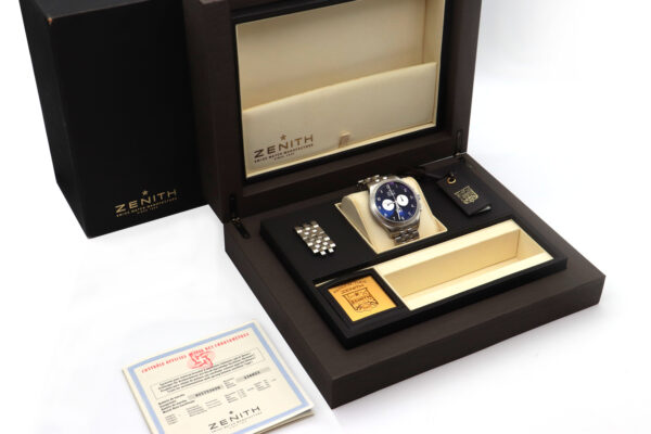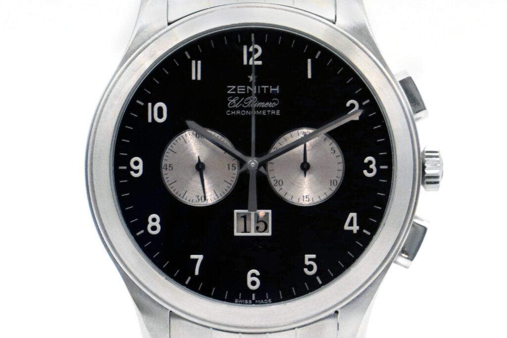 Description : Montre Zénith El Primero Grande Classe en acier, référence 03.0520.4010. Boîtier de 44 mm, cadran noir avec date et chronographe, indexs arabes,