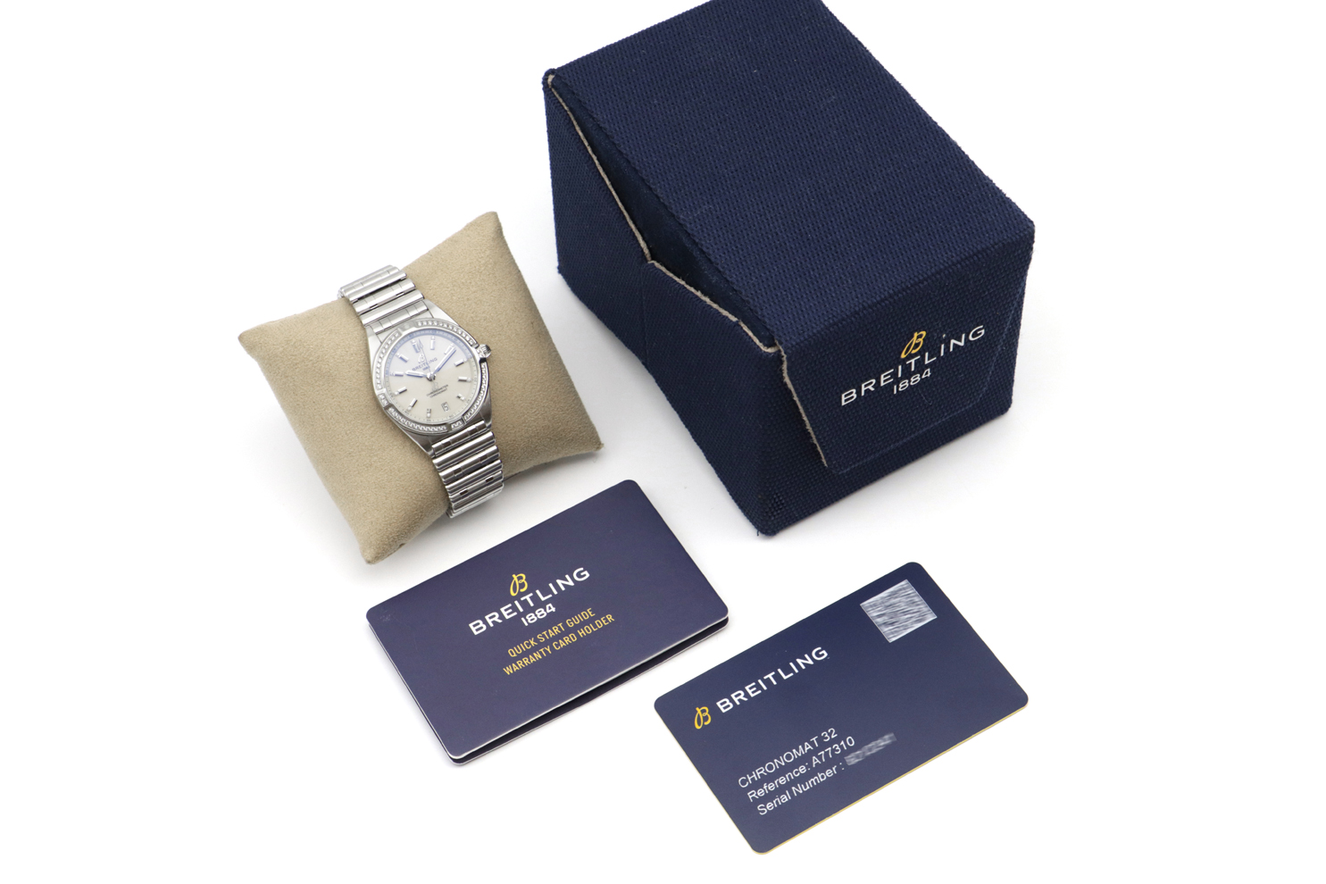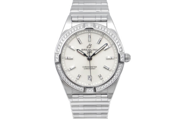 Description : Montre Breitling Chronomat 32. Boitier en acier de 32mm, fond crème et guichet de date à 6h. Lunette sertie de diamants. Bracelet type rouleaux en acier. Mouvement quartz.