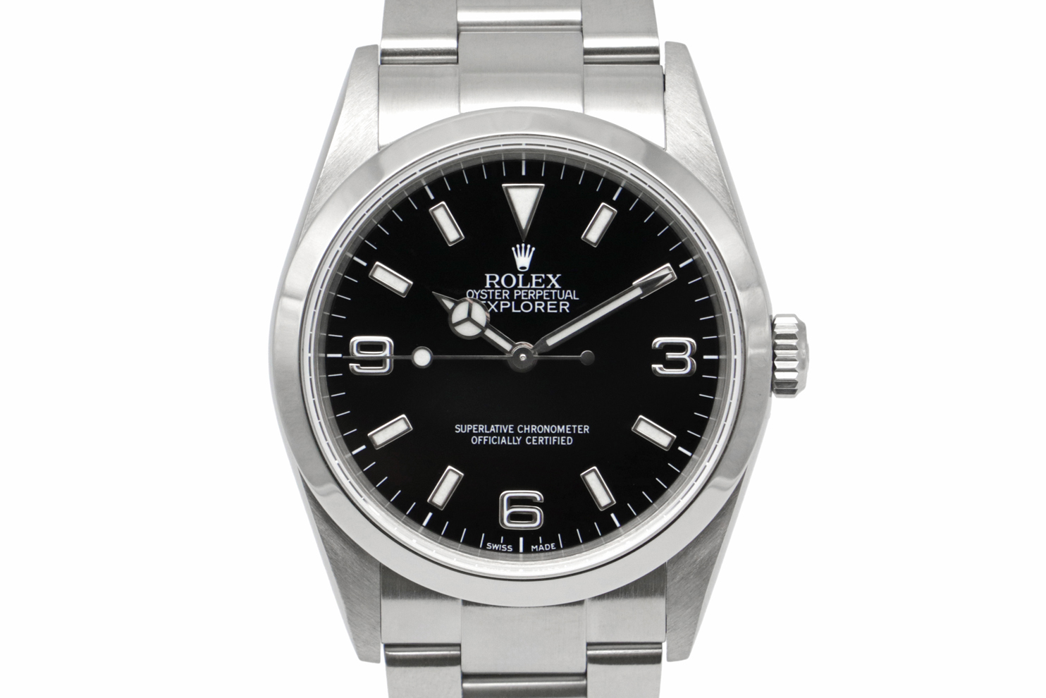 Description : Montre ROLEX Explorer référence 114270 de 2001. Boitier acier de 36mm, fond noir, index 3-6-9, bracelet oyster en acier. Mouvement automatique, cal.3130