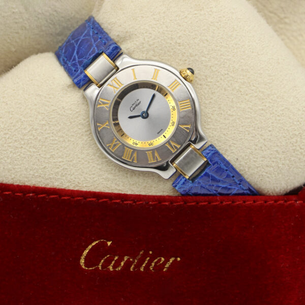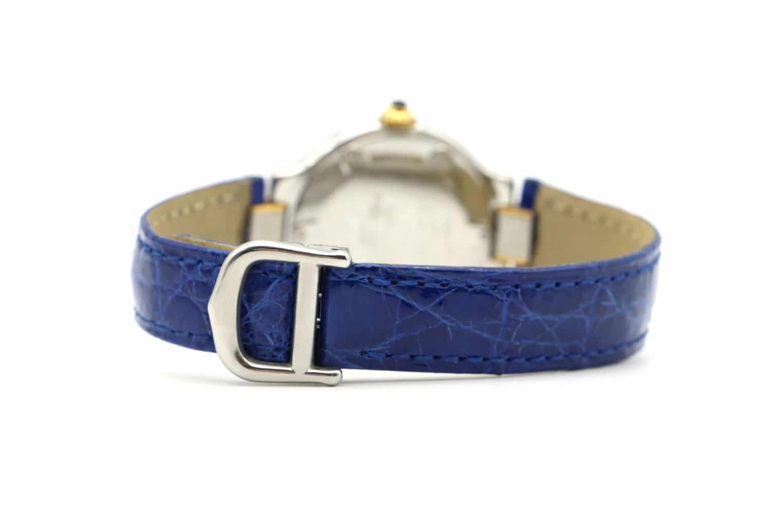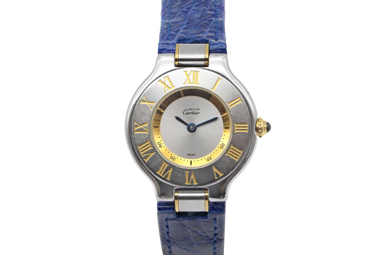 Description : Montre Cartier Must 21 référence 1340. Boitier de 28 mm en Or jaune & Acier, cadran silver, bracelet en cuir alligator bleu, boucle déployante cartier. Mouvement quartz.