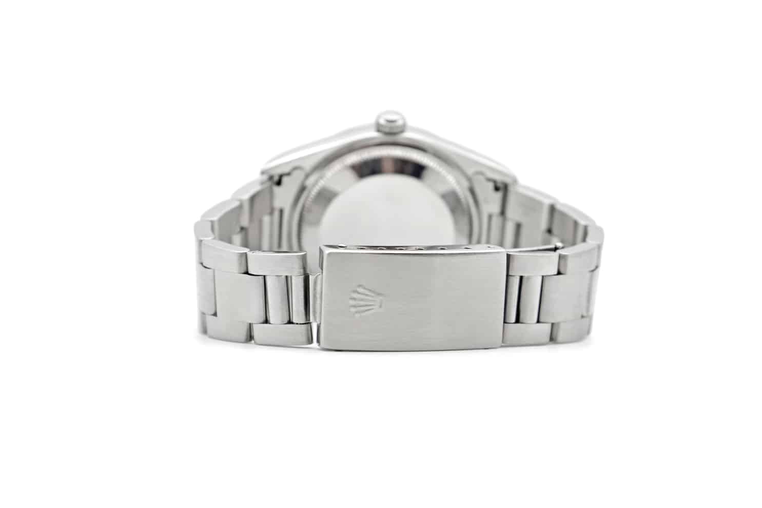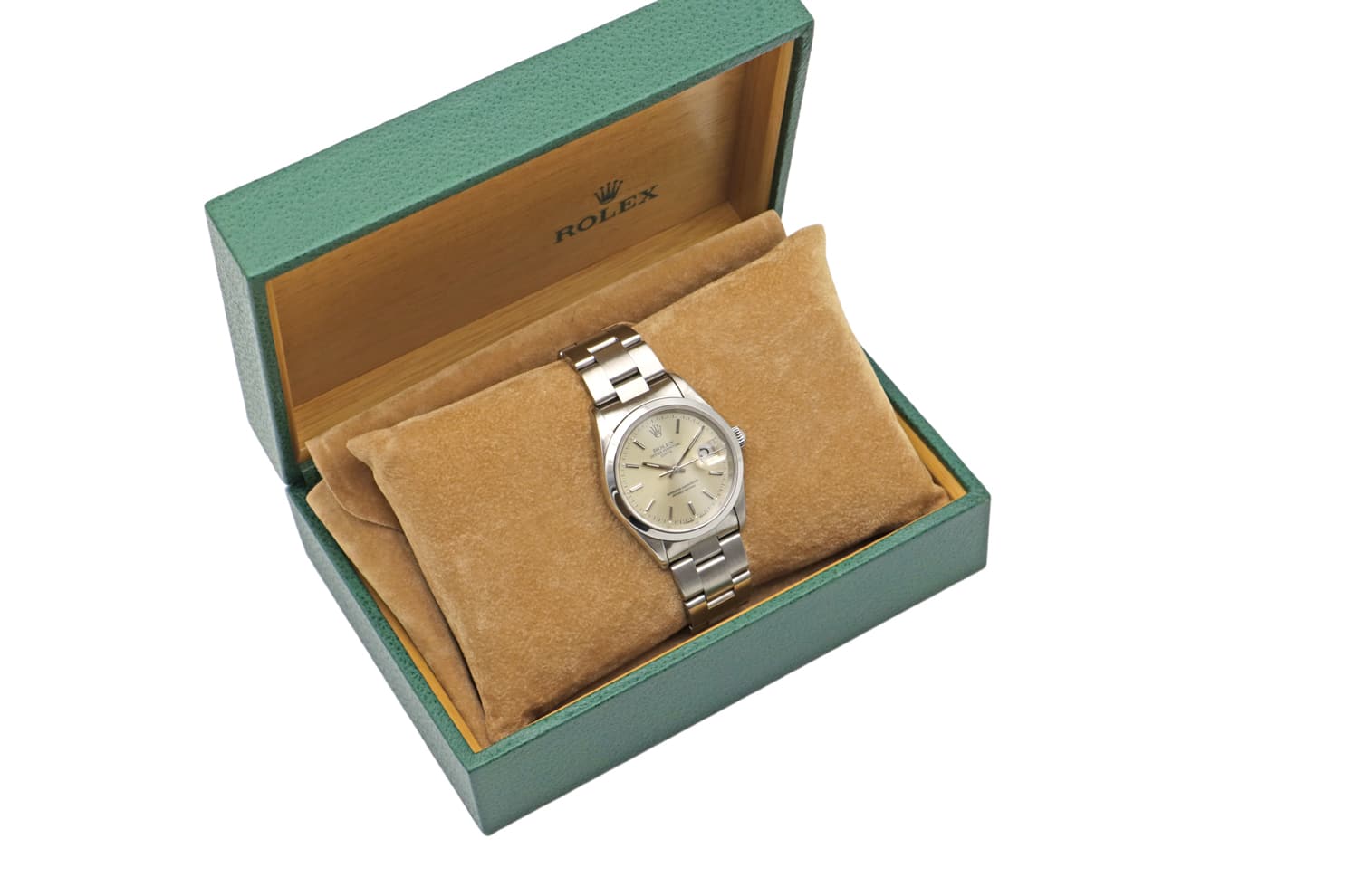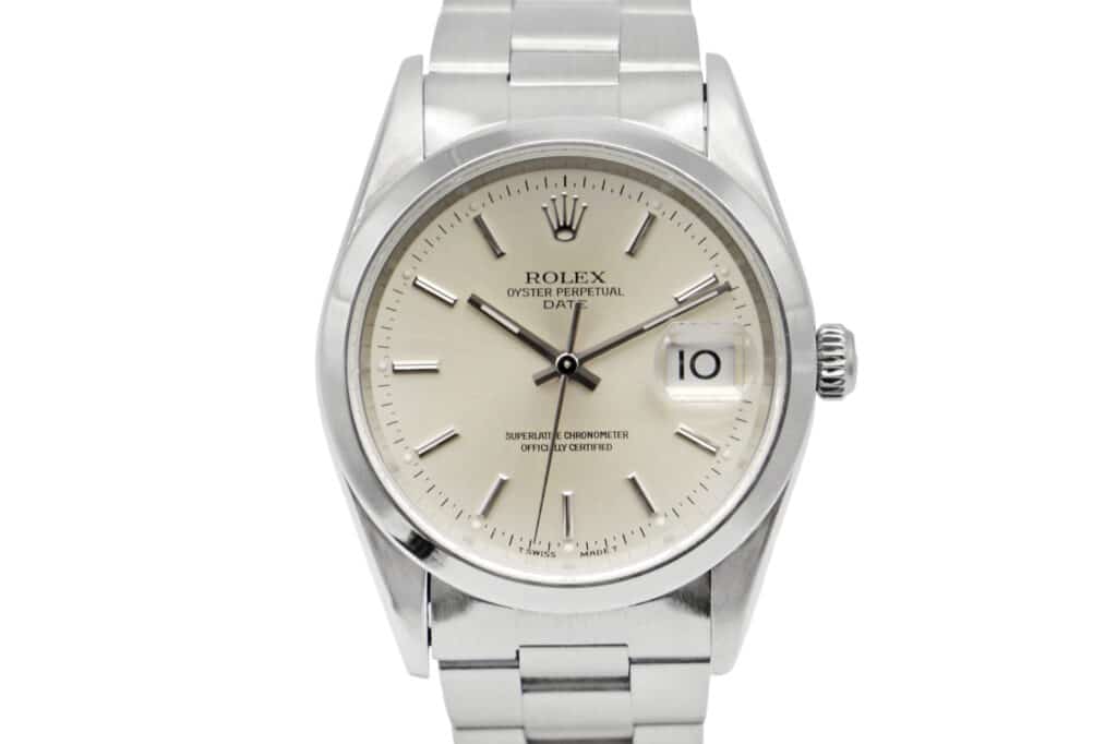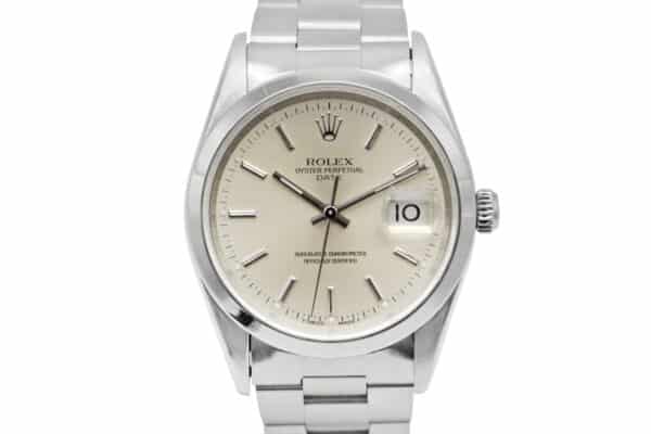Description : Montre Rolex Oyster Perpetual Date en acier référence 15200. Boitier 34mm, cadran silver légèrement pâtiné, index bâtons. Bracelet Oyster. Mouvement automatique, calibre 3035.