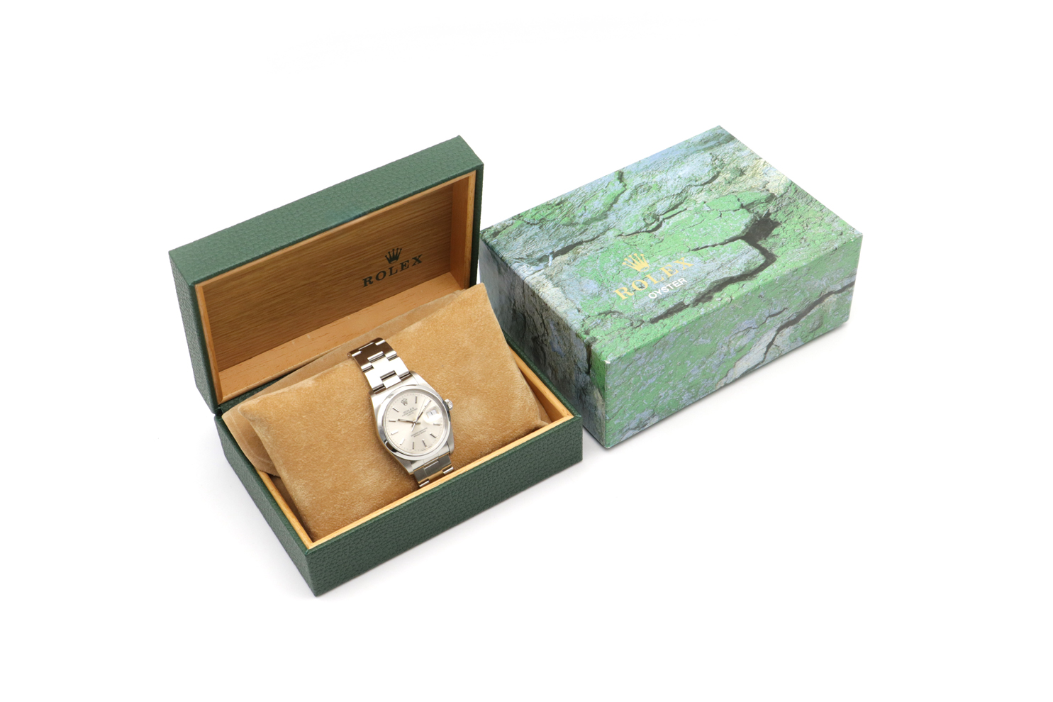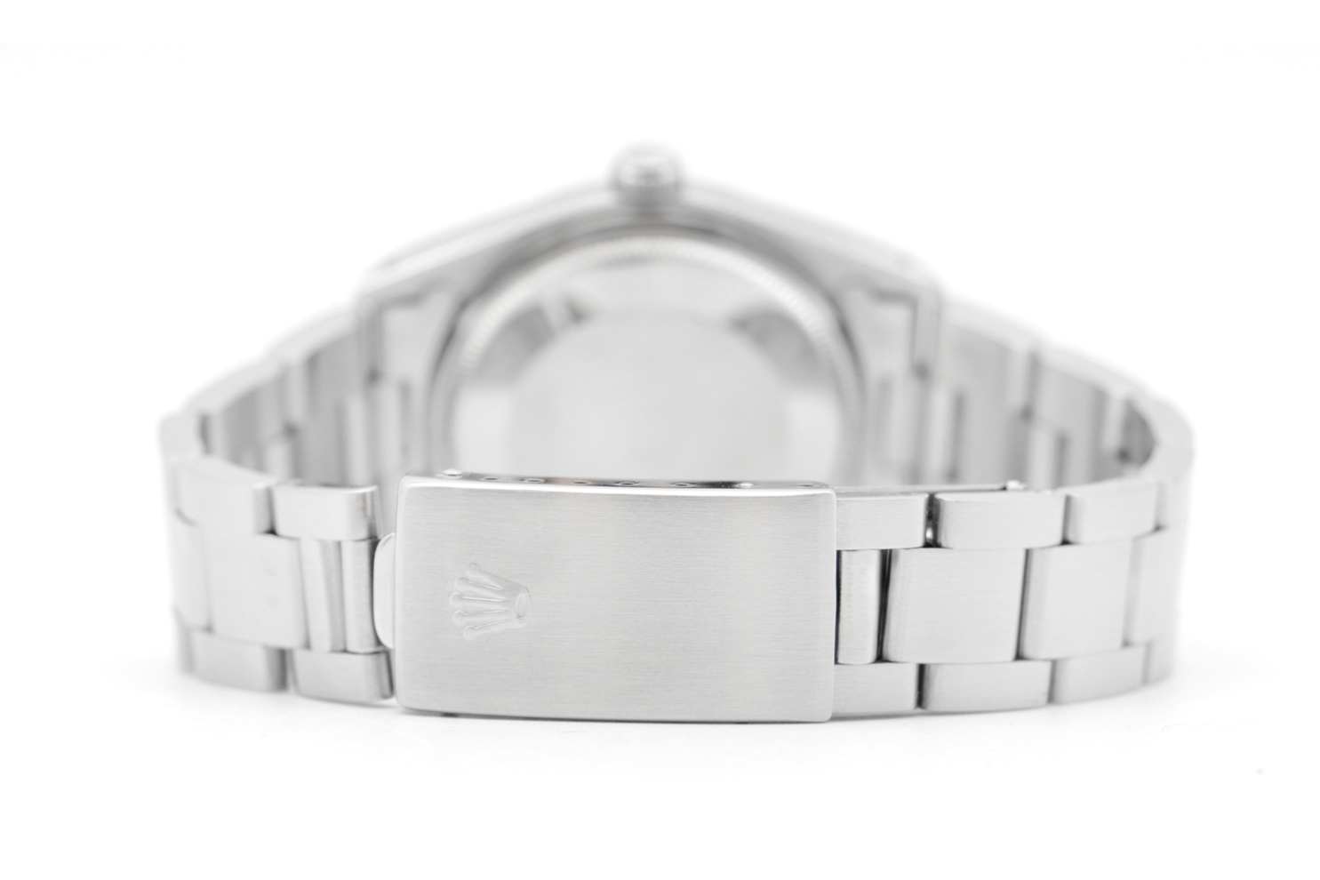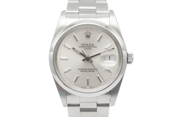 Description : Montre Rolex Oyster Perpetual Date en acier référence 15000 de 1989. Boitier 34mm, cadran silver légèrement pâtiné, index bâtons. Bracelet Oyster. Mouvement automatique, calibre 3035.
