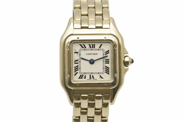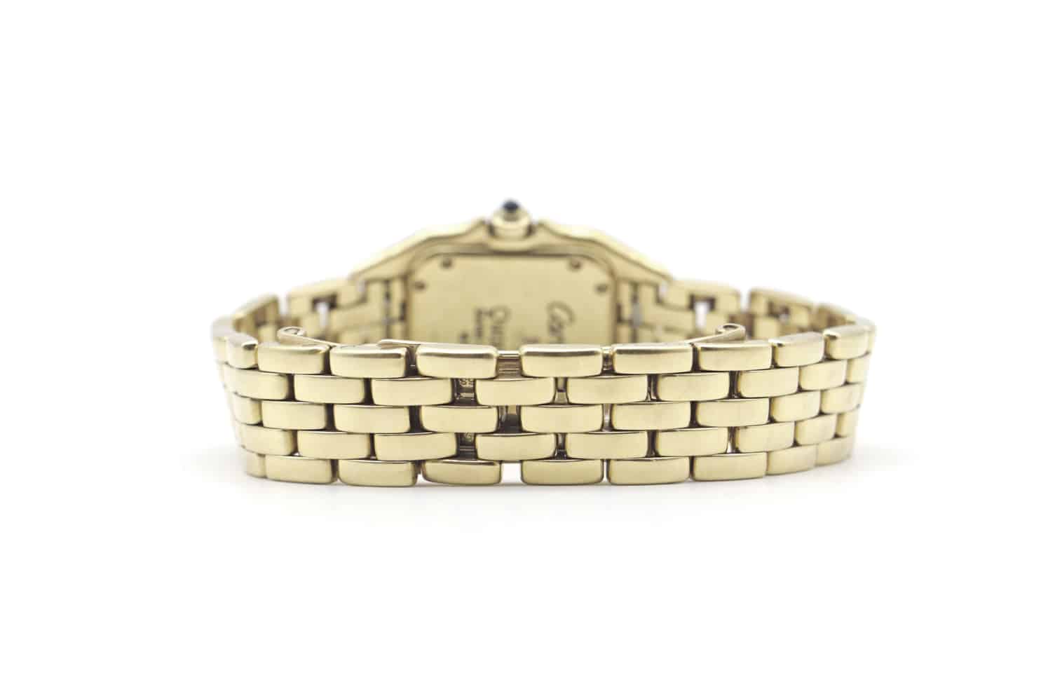 Description : Montre Cartier Panthere référence 8839. Boitier en or jaune de 27mm x 35mm, cadran patiné, bracelet à boucle déployante en or jaune. Mouvement quartz.