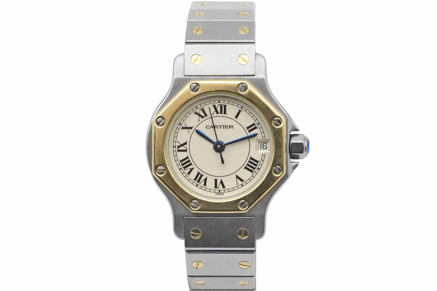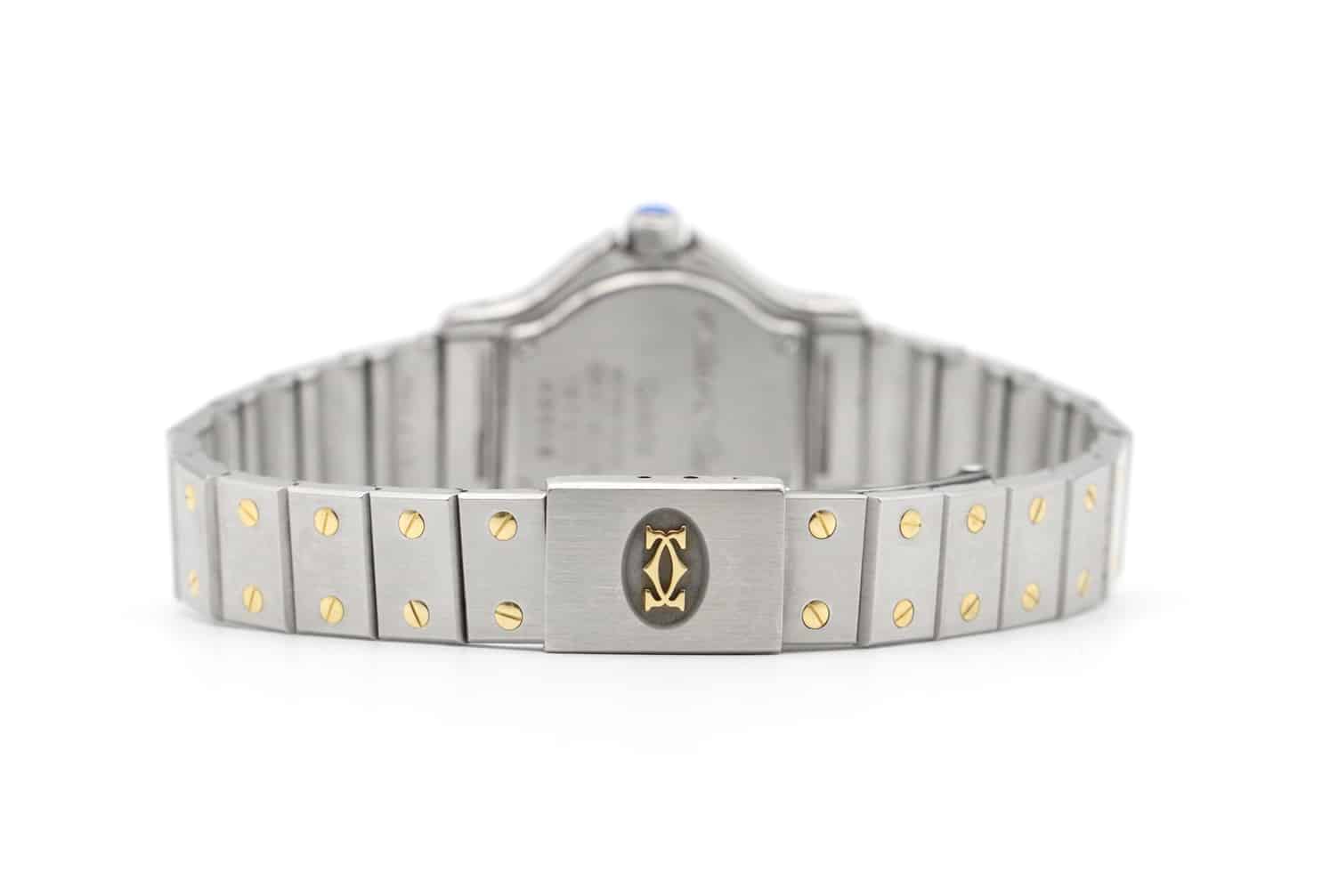 Description : Montre Cartier Santos Octogonale ref.187903. Boitier en or jaune et acier de 25mm, cadran blanc, bracelet à boucle déployante en or jaune et acier. Mouvement quartz.